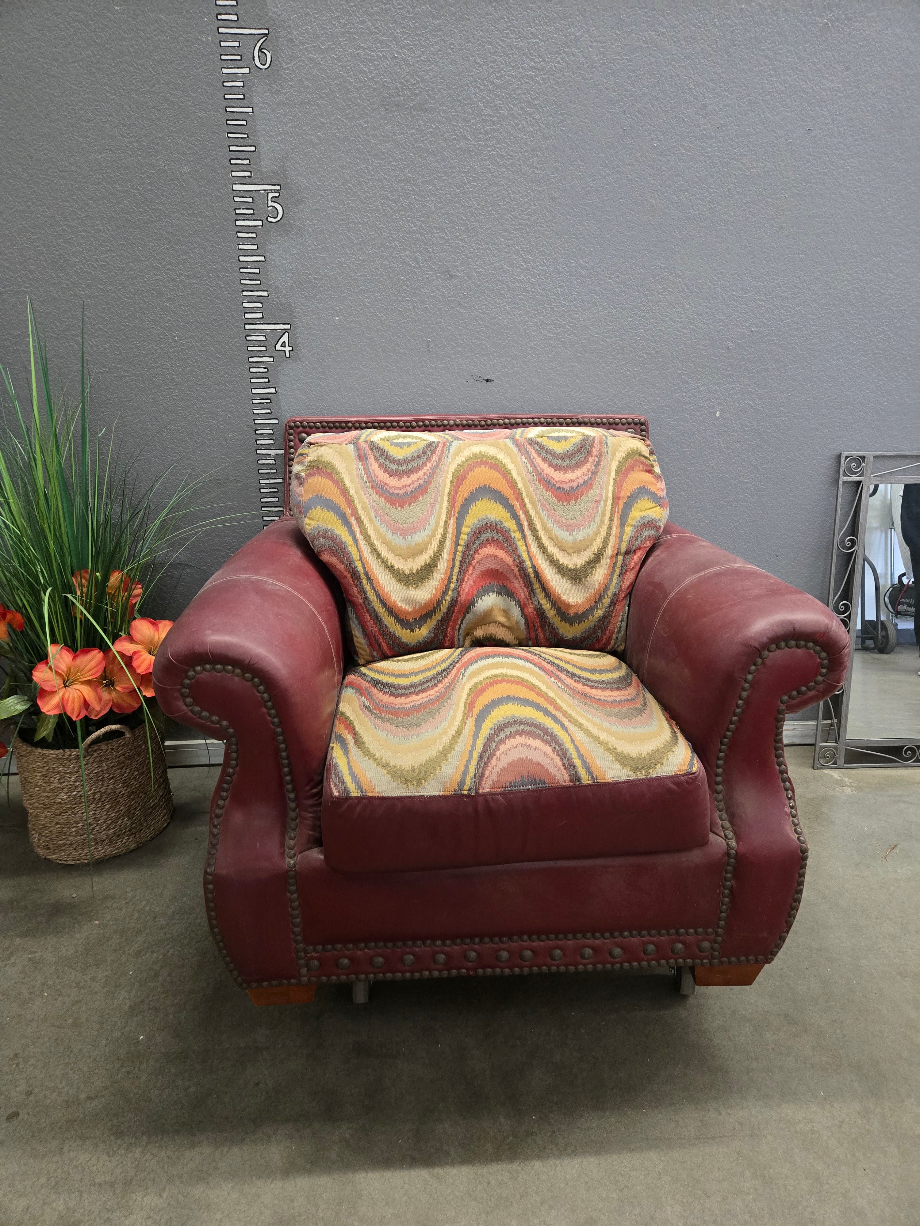 This armchair features a deep red leather finish with a cushioned seat and backrest covered in a vibrant, wavy pattern fabric. The nailhead trim adds a touch of elegance to this sturdy piece. Approximate Size: 3 x 4 x 3