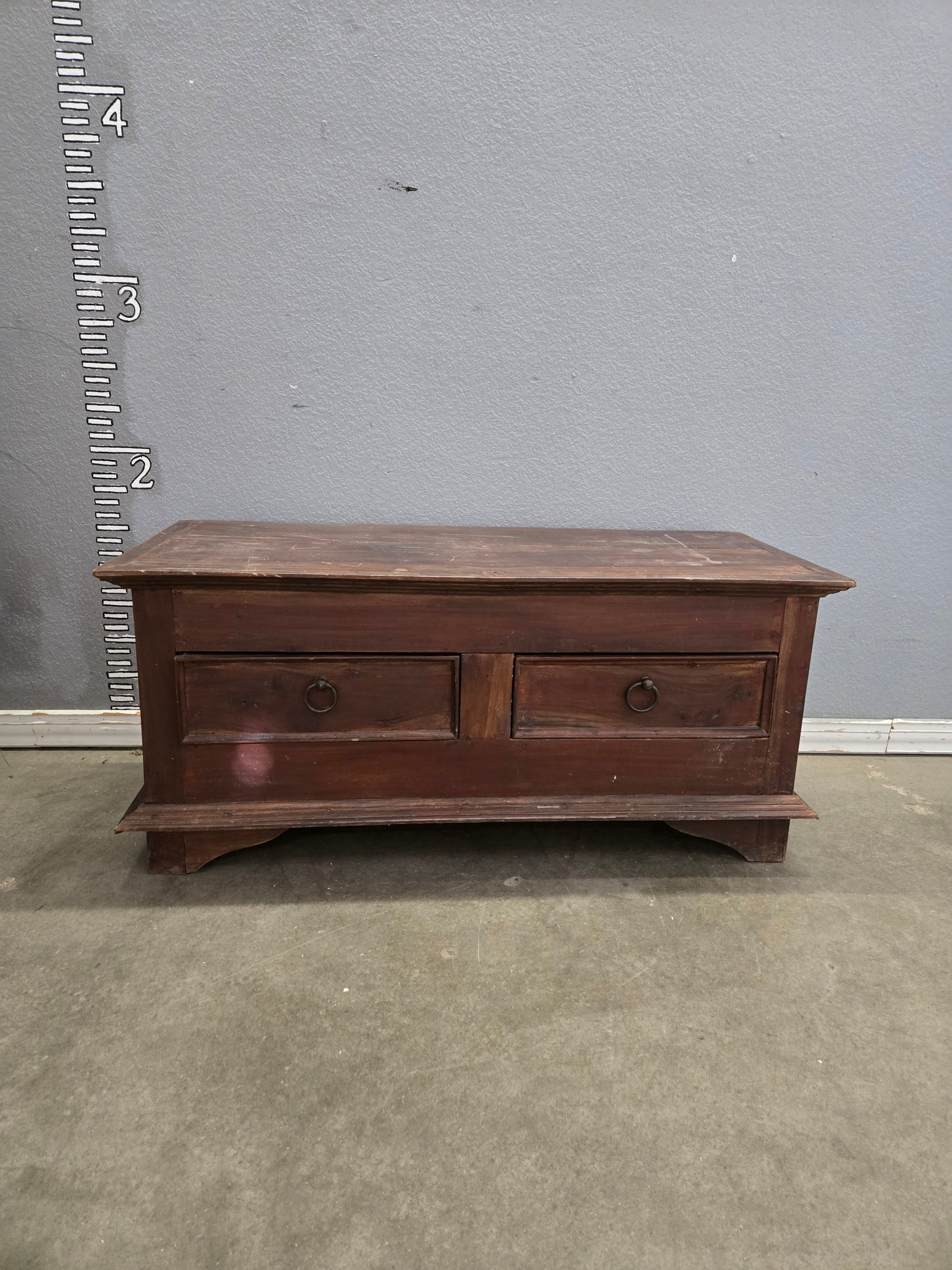 This charming rustic wooden chest features a rich brown finish. It includes two spacious drawers with metallic ring handles, providing ample storage. Perfect for adding a vintage touch to your home decor. Approximate Size: 2 x 3.5 x 1.5