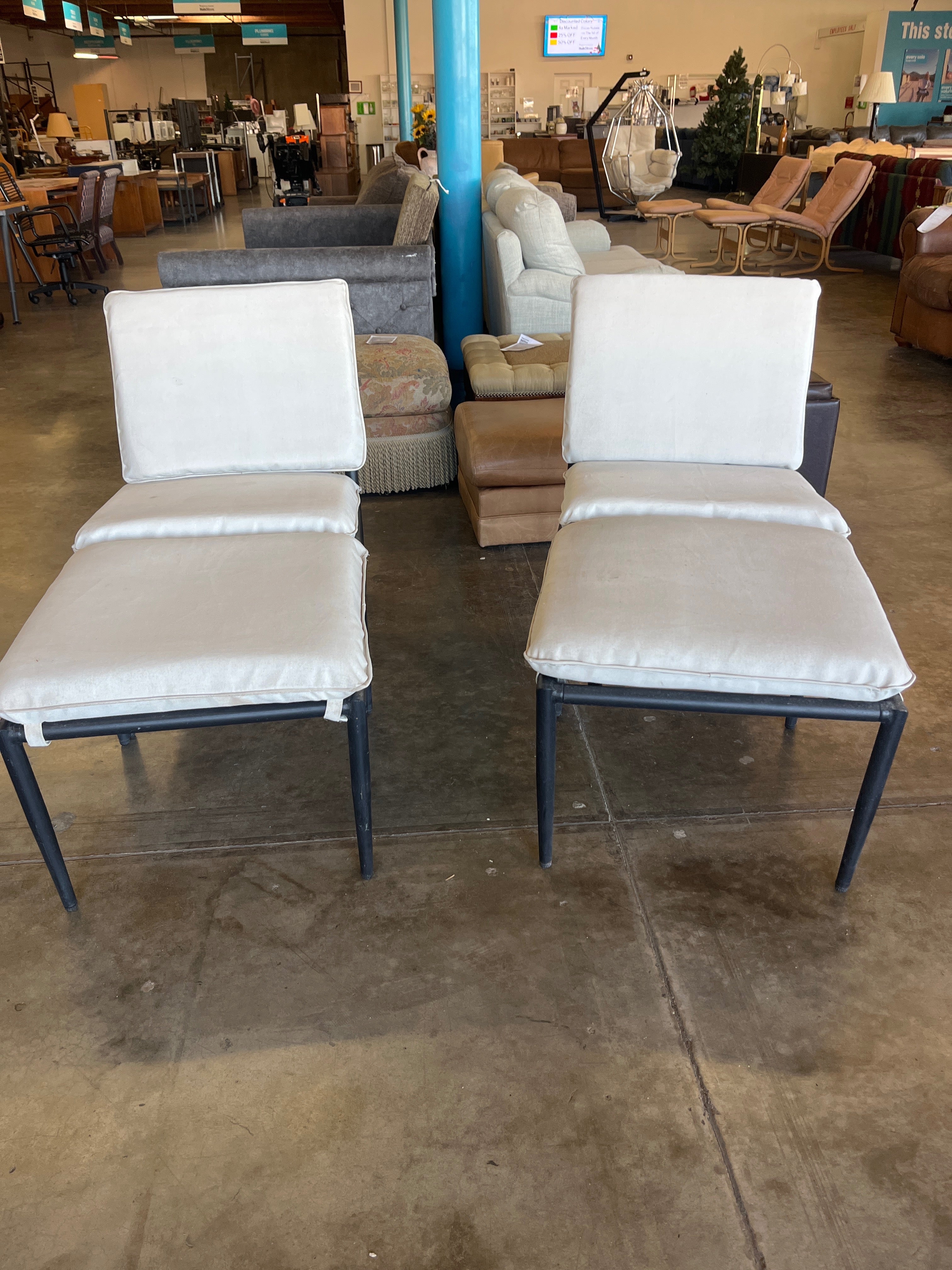 These elegant lounge chairs feature a soft, cream fabric with a sleek matte black metal frame. Ideal for any contemporary living space. Approximate Size: 2.5 x 1.8 x 2.5