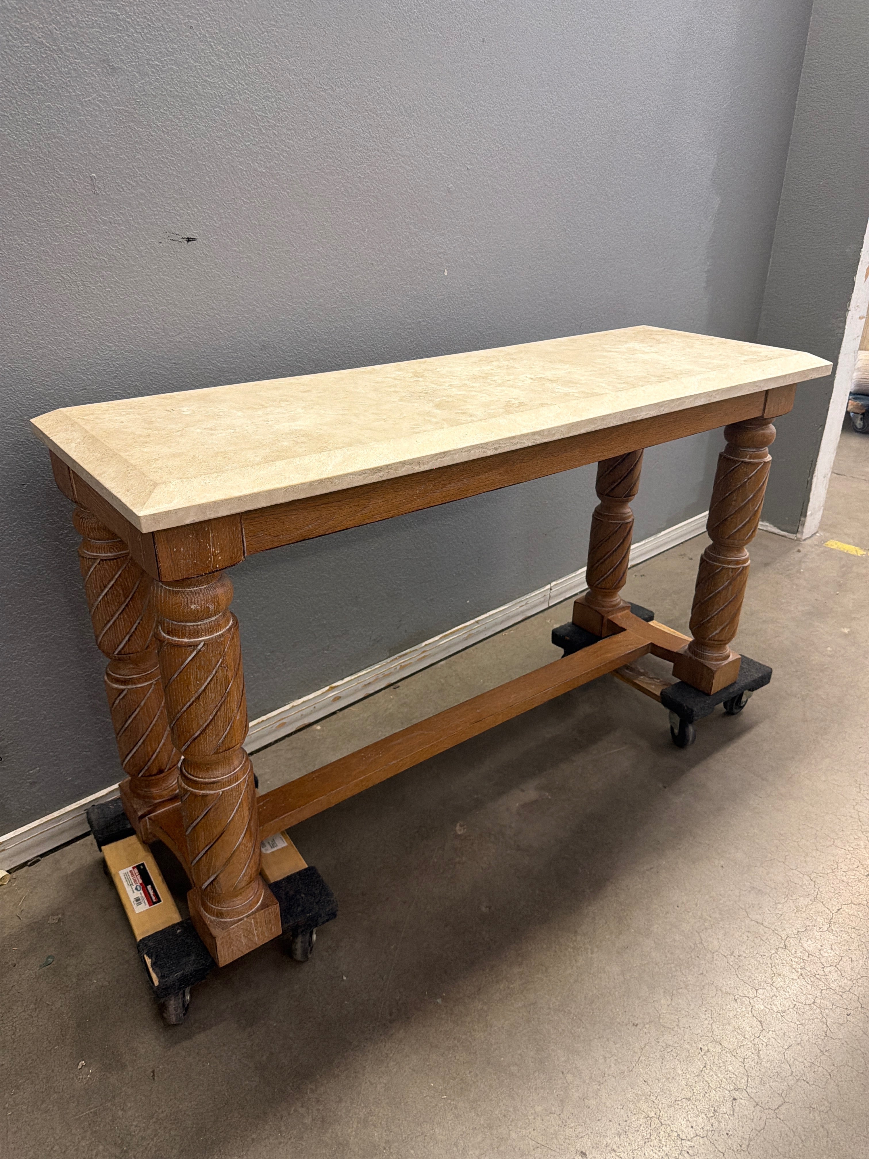 This graceful console table features a sleek beige marble top with a polished finish, elegantly paired with intricately carved wooden legs in a warm oak tone. Approximate Size: 3 x 5 x 1.5