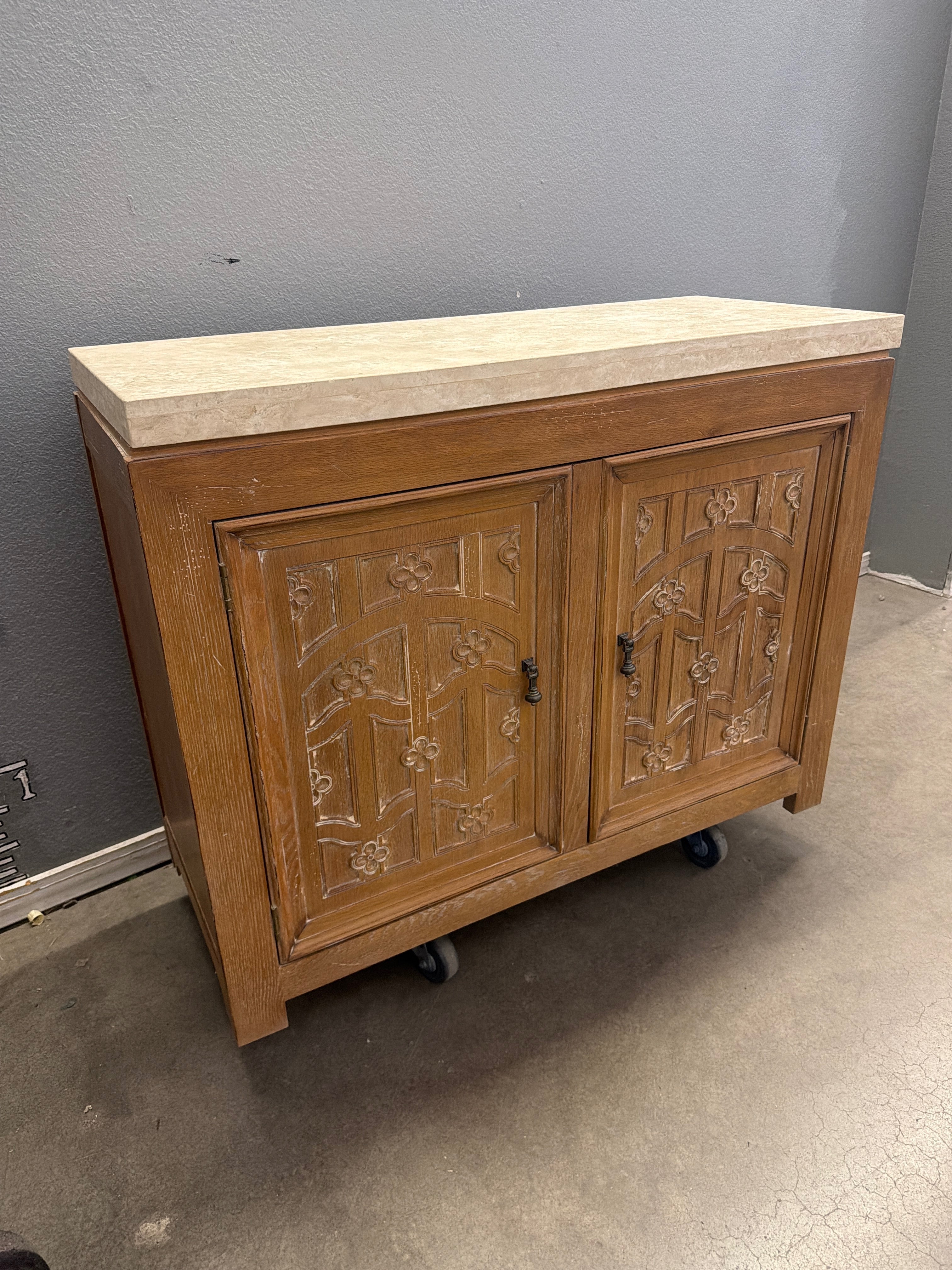 This elegant vintage cabinet features a rich brown wooden finish with intricate carved details on the doors. The top is adorned with a smooth, cream-colored marble surface, adding a touch of sophistication. The cabinet is equipped with four caster wheels for easy mobility. Approximate Size: 3 x 4 x 1.5