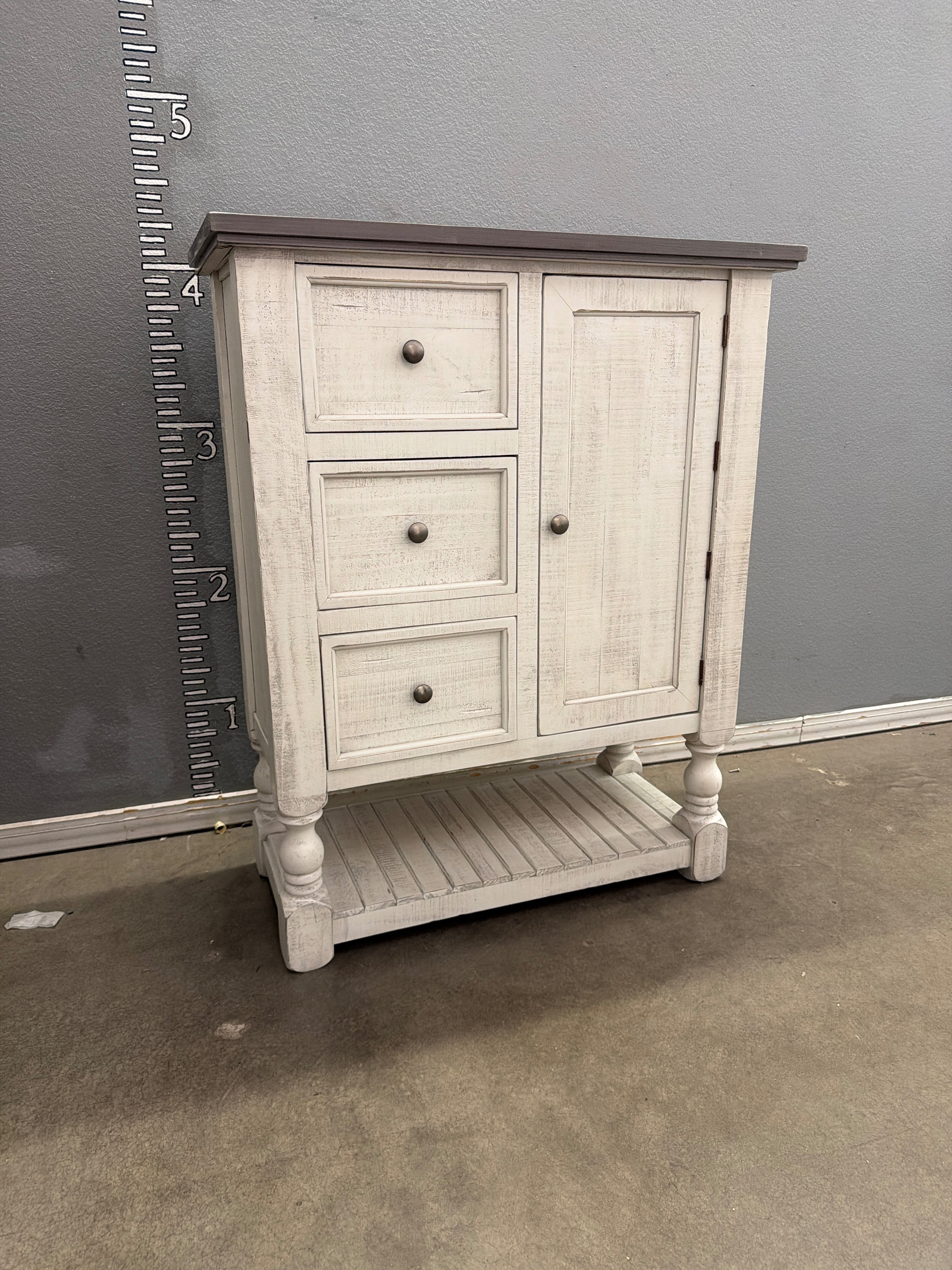 This charming cabinet features a rustic white finish with a contrasting darker wood top, creating an elegant and timeless look. The cabinet includes three drawers and a door, perfect for additional storage. The distressed look and turned legs add character to any space. Approximate Size: 4 x 2.5 x 1.5