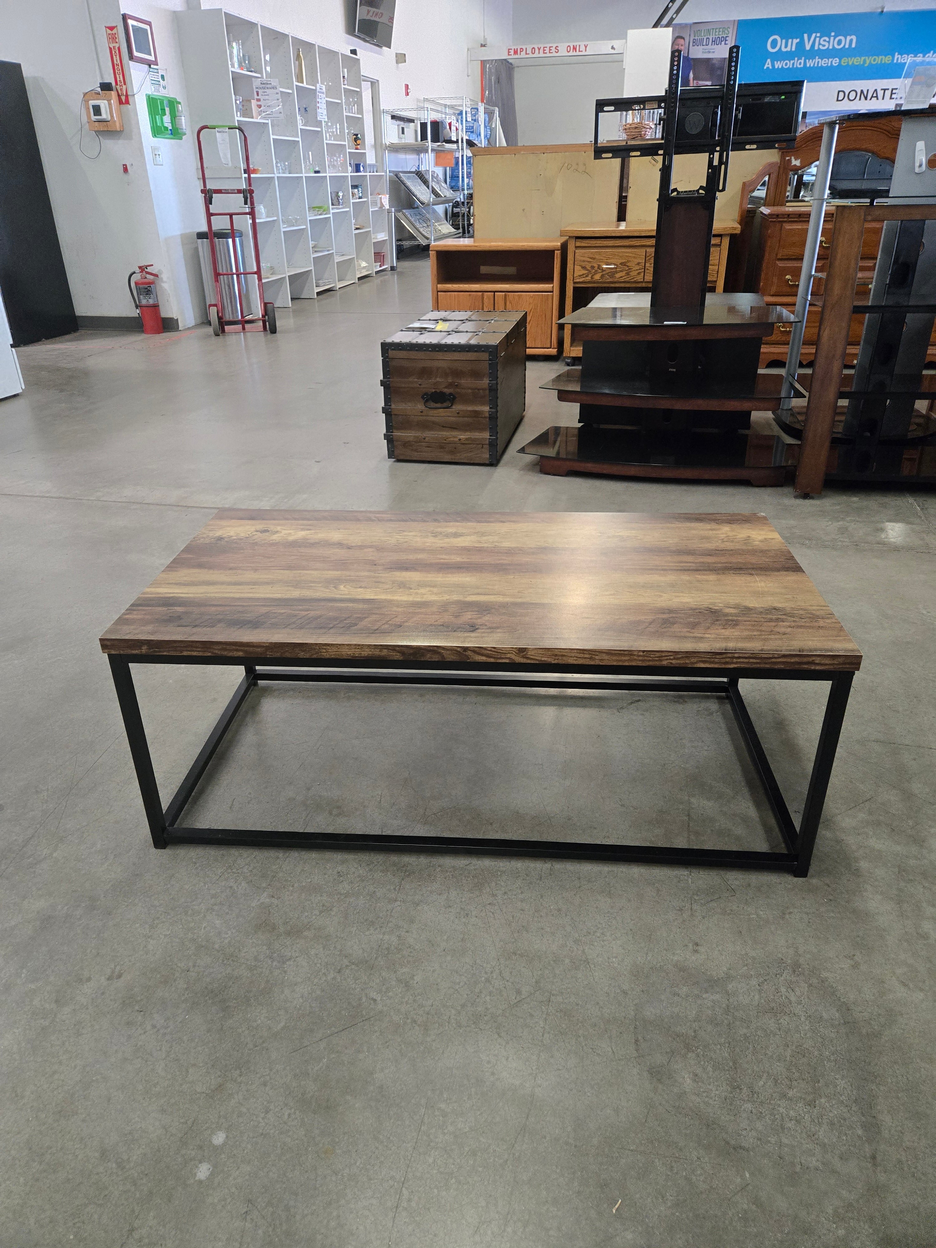 This sleek coffee table features a smooth wood top with a rich brown finish contrasted by a sturdy black metal base. Perfect for modern and industrial-themed living spaces. Approximate Size: 1.5 x 4 x 2