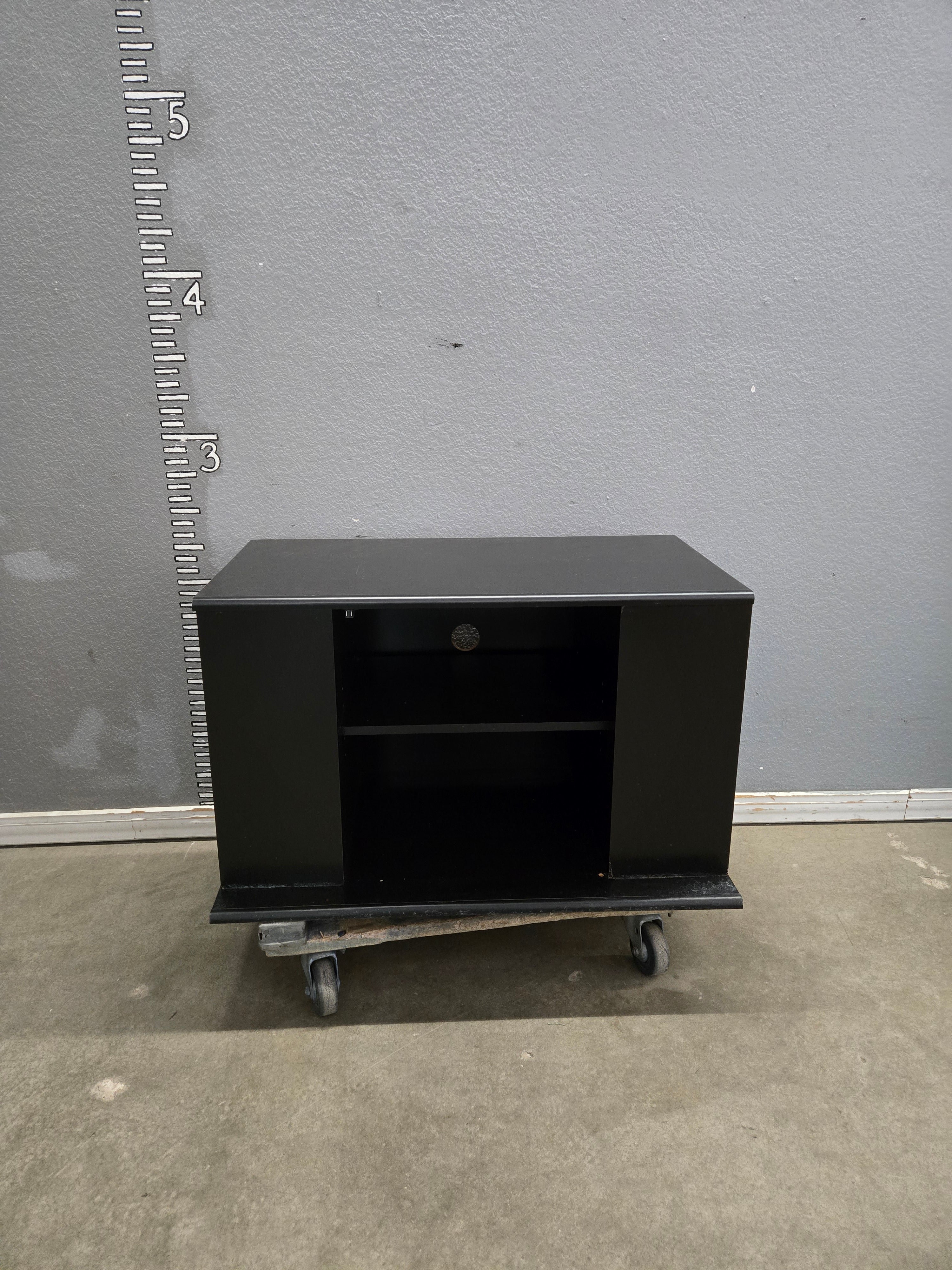 This compact TV stand features a sleek black finish, perfect for adding a modern touch to your living room. It includes two open shelves for storing media devices and accessories. Approximate Size: 2.5 x 2.5 x 1.5