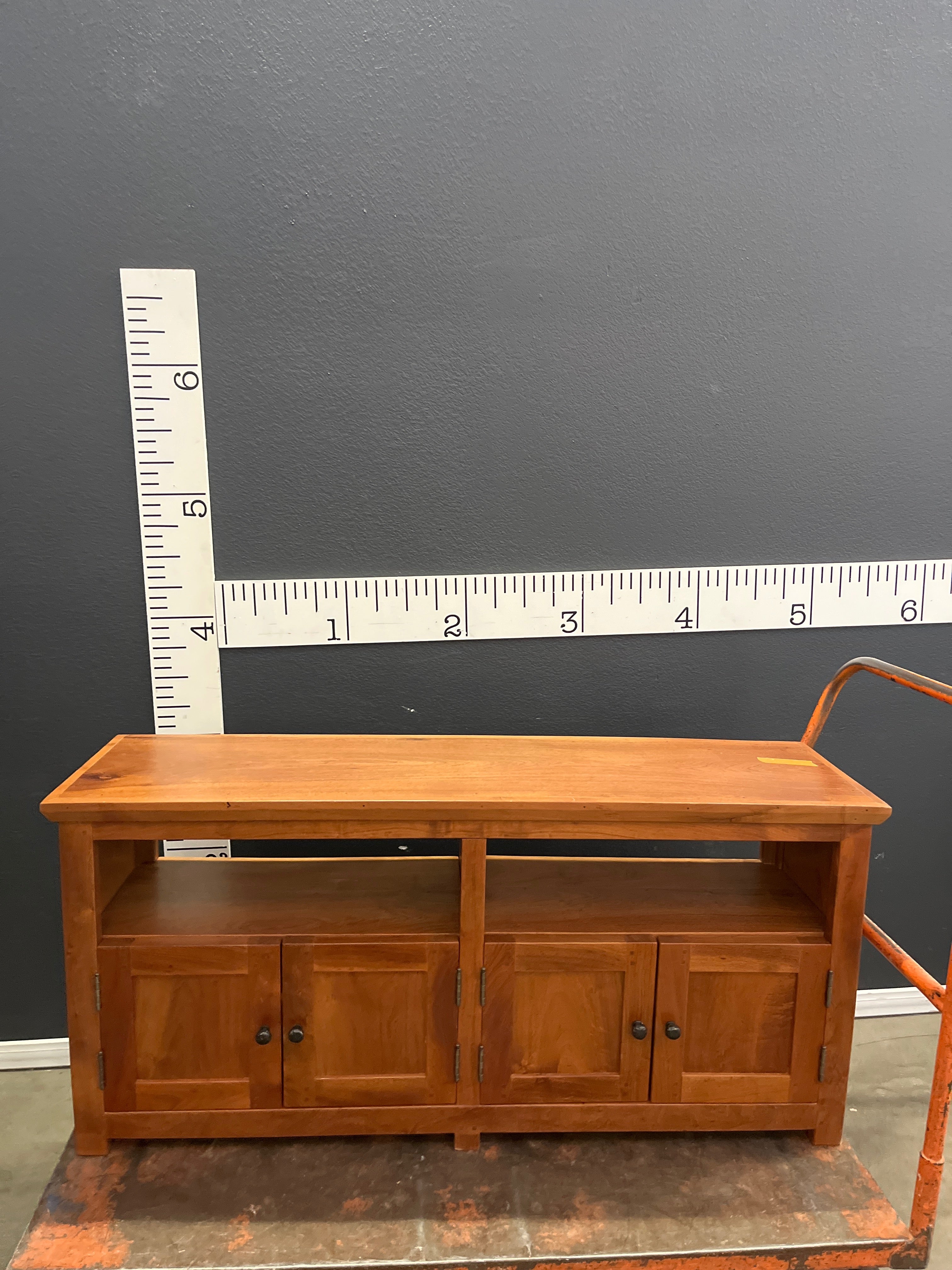 This elegant console table is crafted from solid wood with a warm, medium brown finish. It features two open shelves and two double-door cabinets for ample storage space, perfect for organizing your living room essentials. Approximate Size: 3 x 4 x 1.5