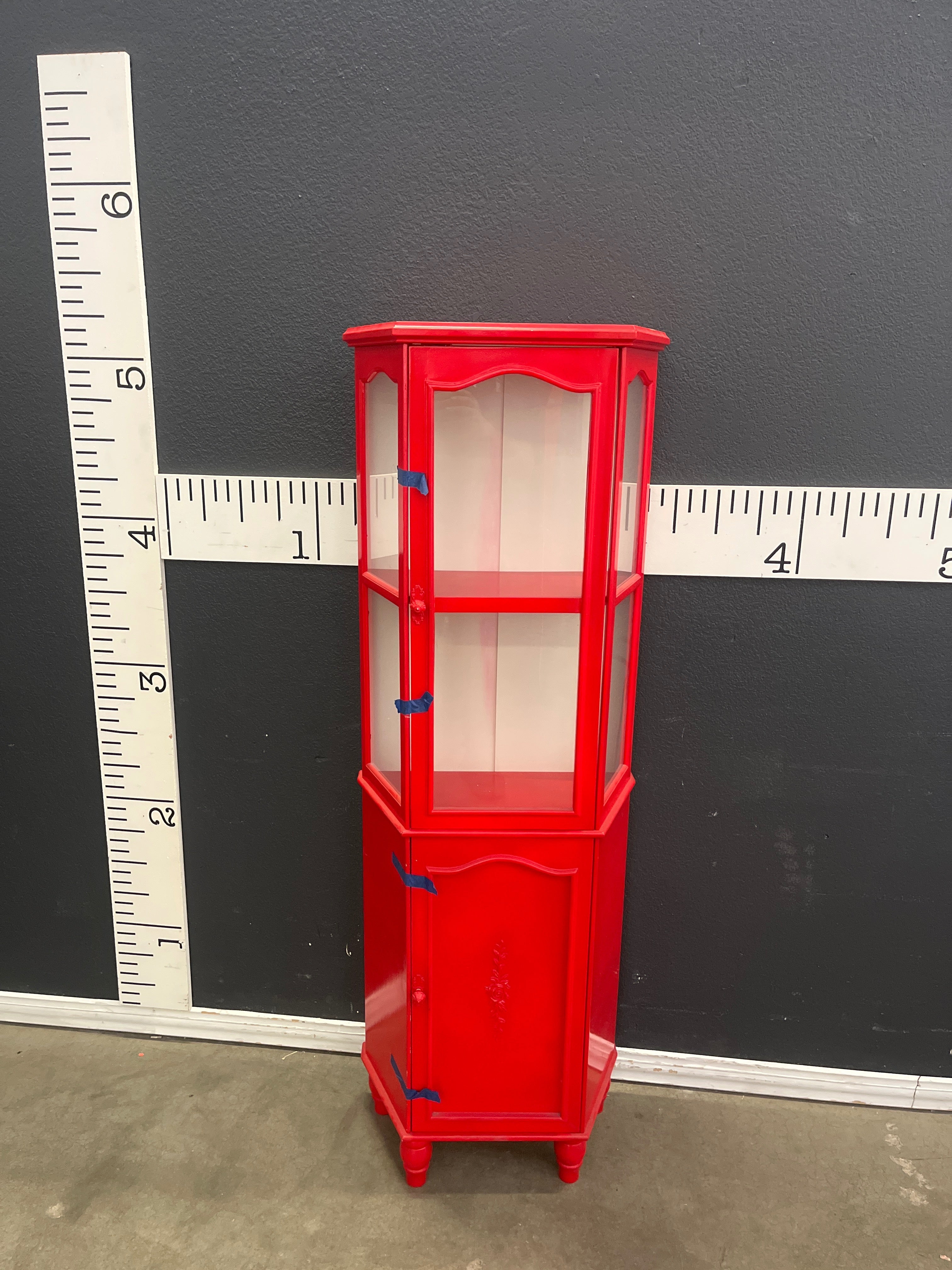 This vibrant red corner curio cabinet features a glossy finish, designed to showcase your collectibles with style. Its bold color and detailed design make it a standout piece. Approximate Size: 5 x 1.5 x 1.5