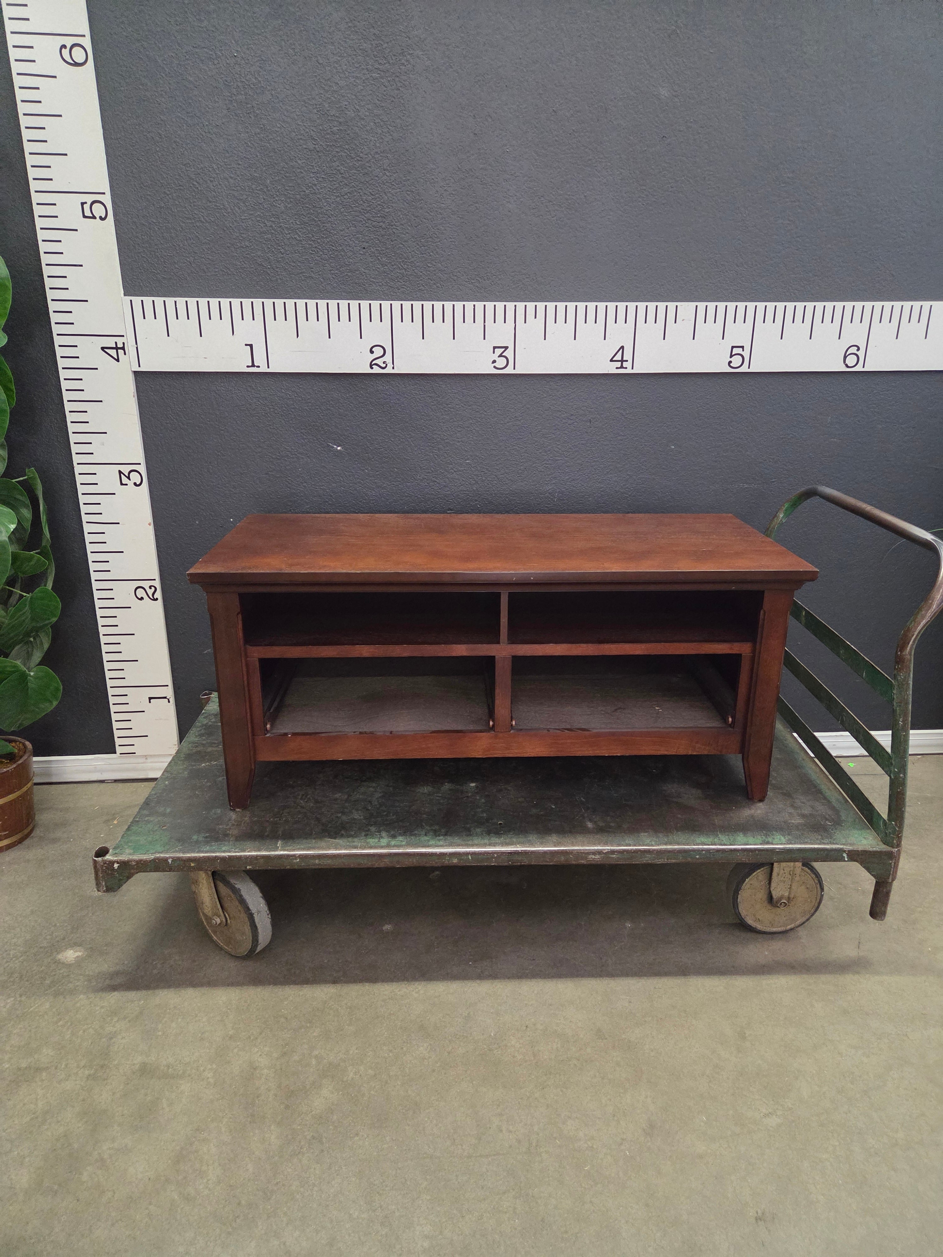 This vintage wooden coffee table features a rich brown finish, offering a classic look for your living room. Its sturdy wooden construction includes two open storage shelves, ideal for organizing books or displaying decorative items. Approximate Size: 1.5 x 3 x 1.5