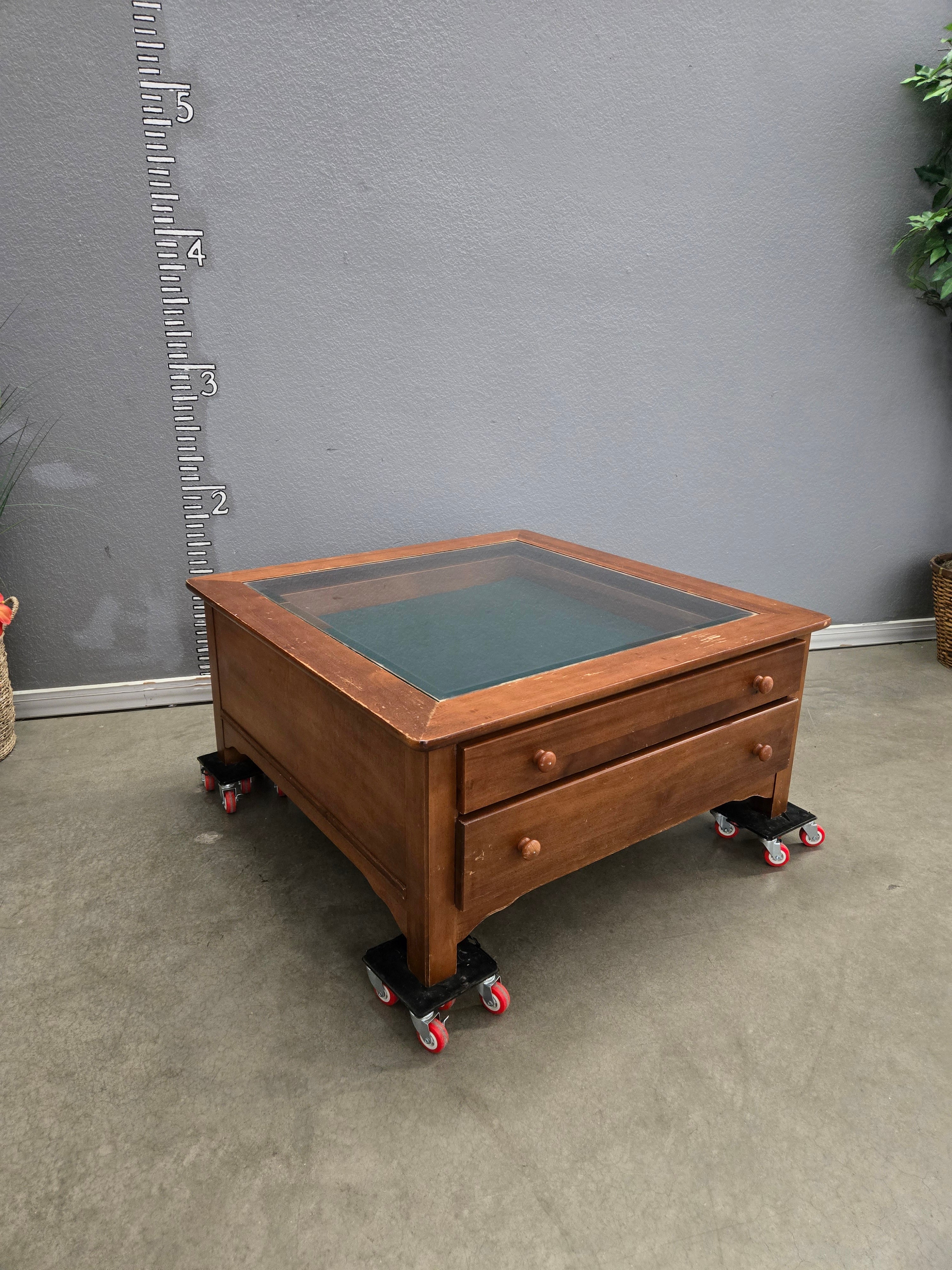 This charming coffee table features a warm brown wooden finish and a sleek glass top, perfect for adding a touch of elegance to any living space. The table is equipped with convenient drawers for extra storage. Approximate Size: 2.5 x 3 x 3