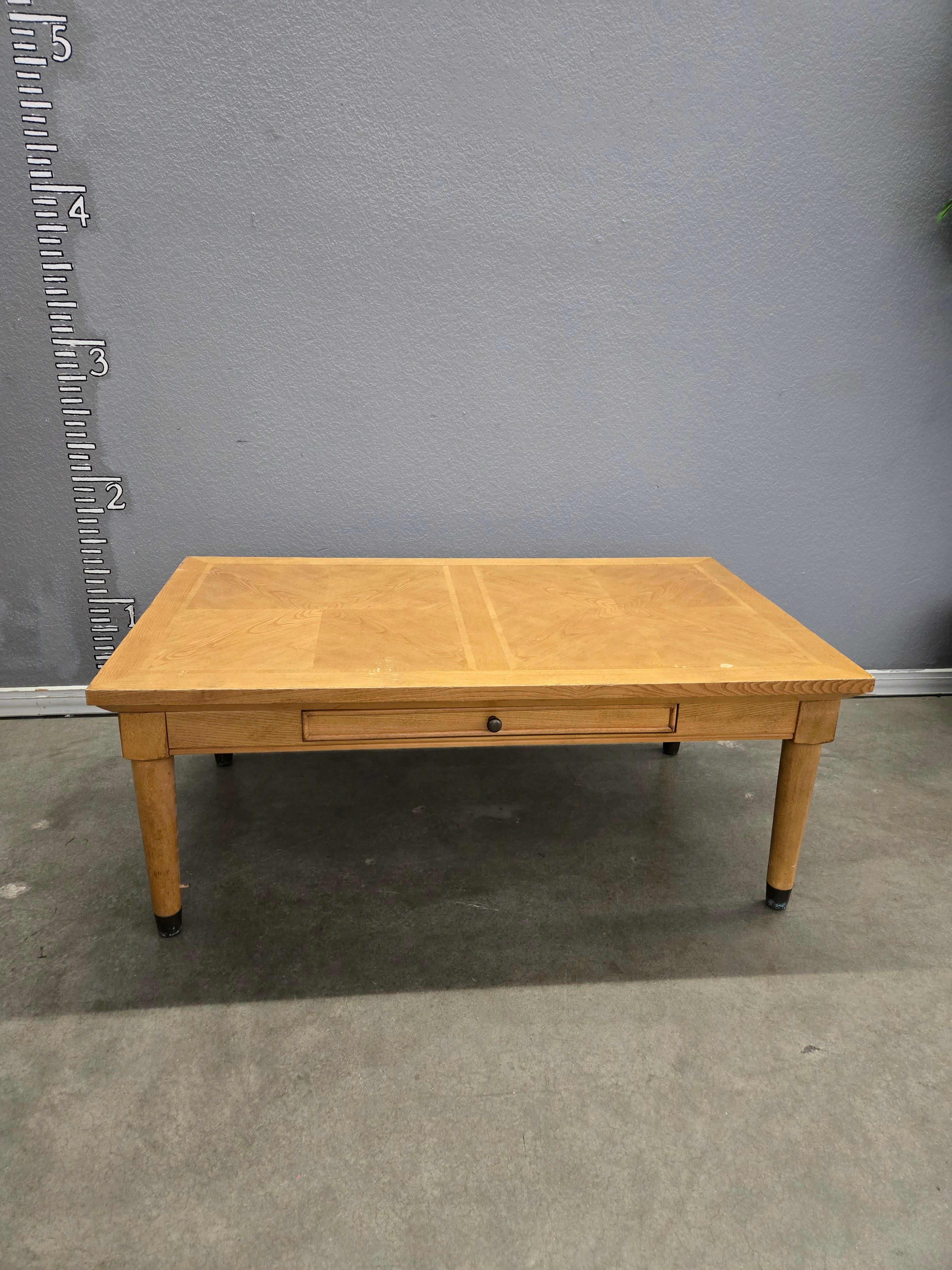 This sturdy coffee table features a natural oak finish with a smooth surface and a functional drawer for additional storage. Its classic design makes it a perfect addition to any living room. Approximate Size: 1.5 x 3 x 2
