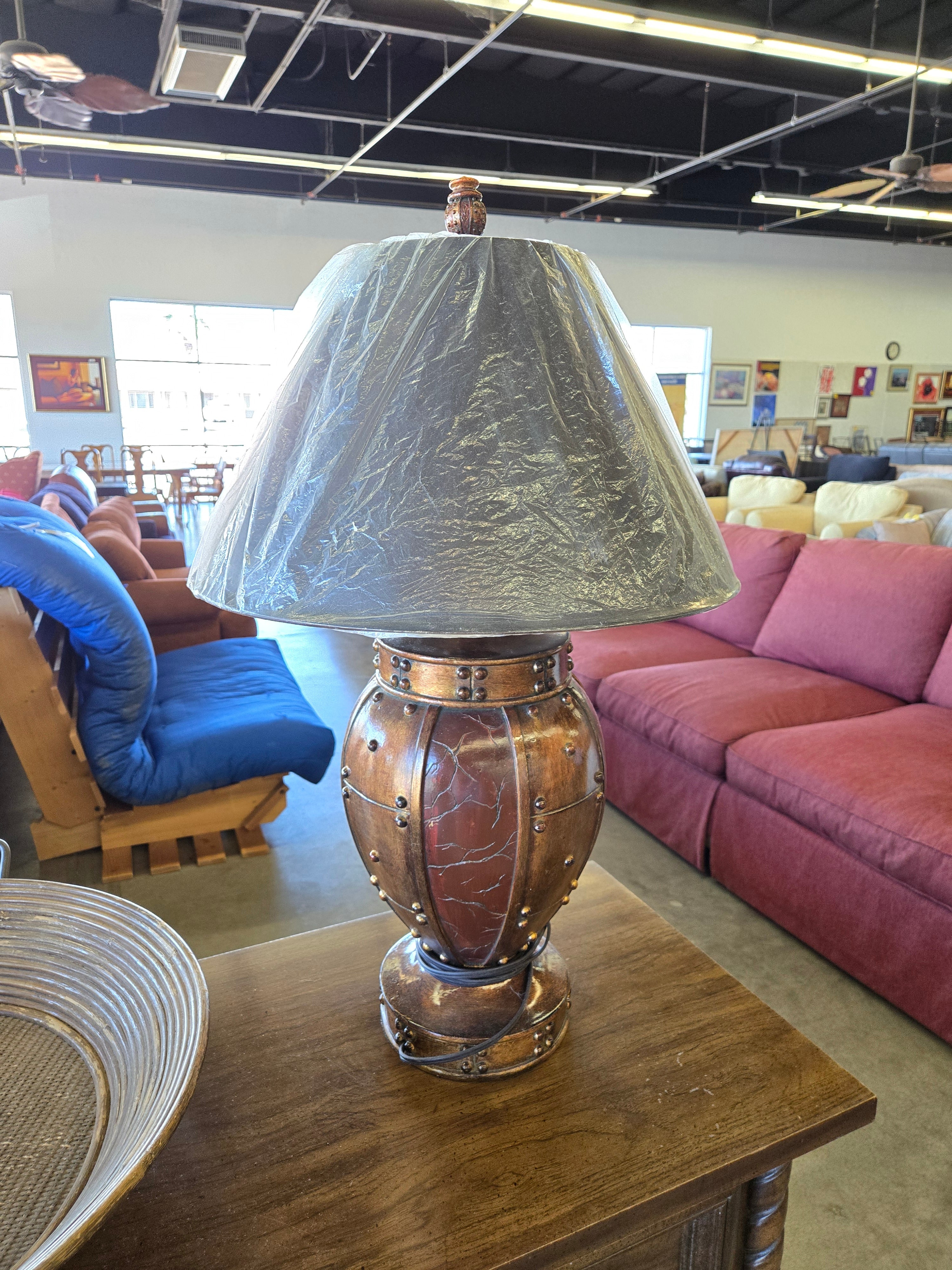 This elegant table lamp features a rustic bronze finish with a textured fabric shade. The robust design is embellished with metal accents, making it an ideal statement piece for any space. Approximate Size: 2.5 x 1.5 x 1.5