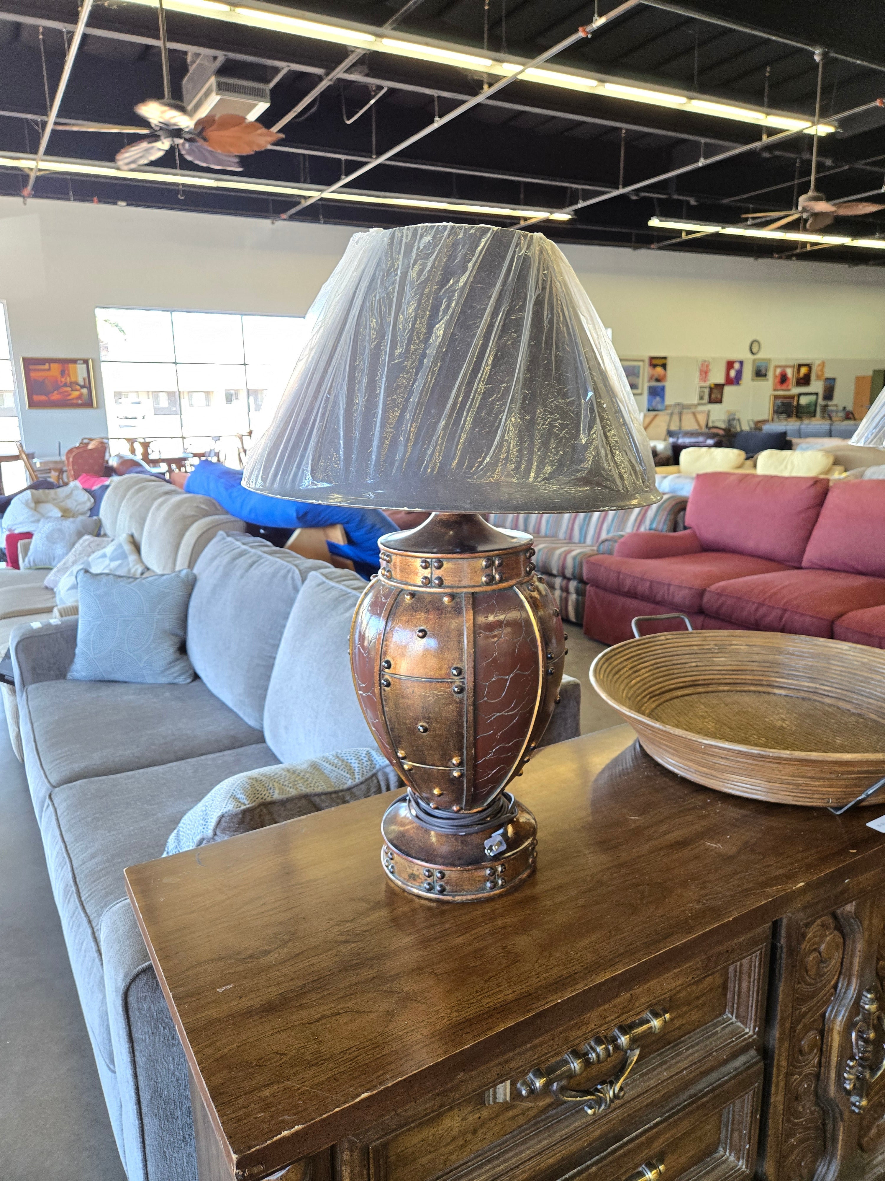Elegant vintage table lamp featuring a bronze-toned base with studded embellishments and a leather finish. The shade is a dark brown fabric with a plastic cover. This lamp's sturdy design offers a classic aesthetic. Approximate Size: 2.5 x 1 x 1