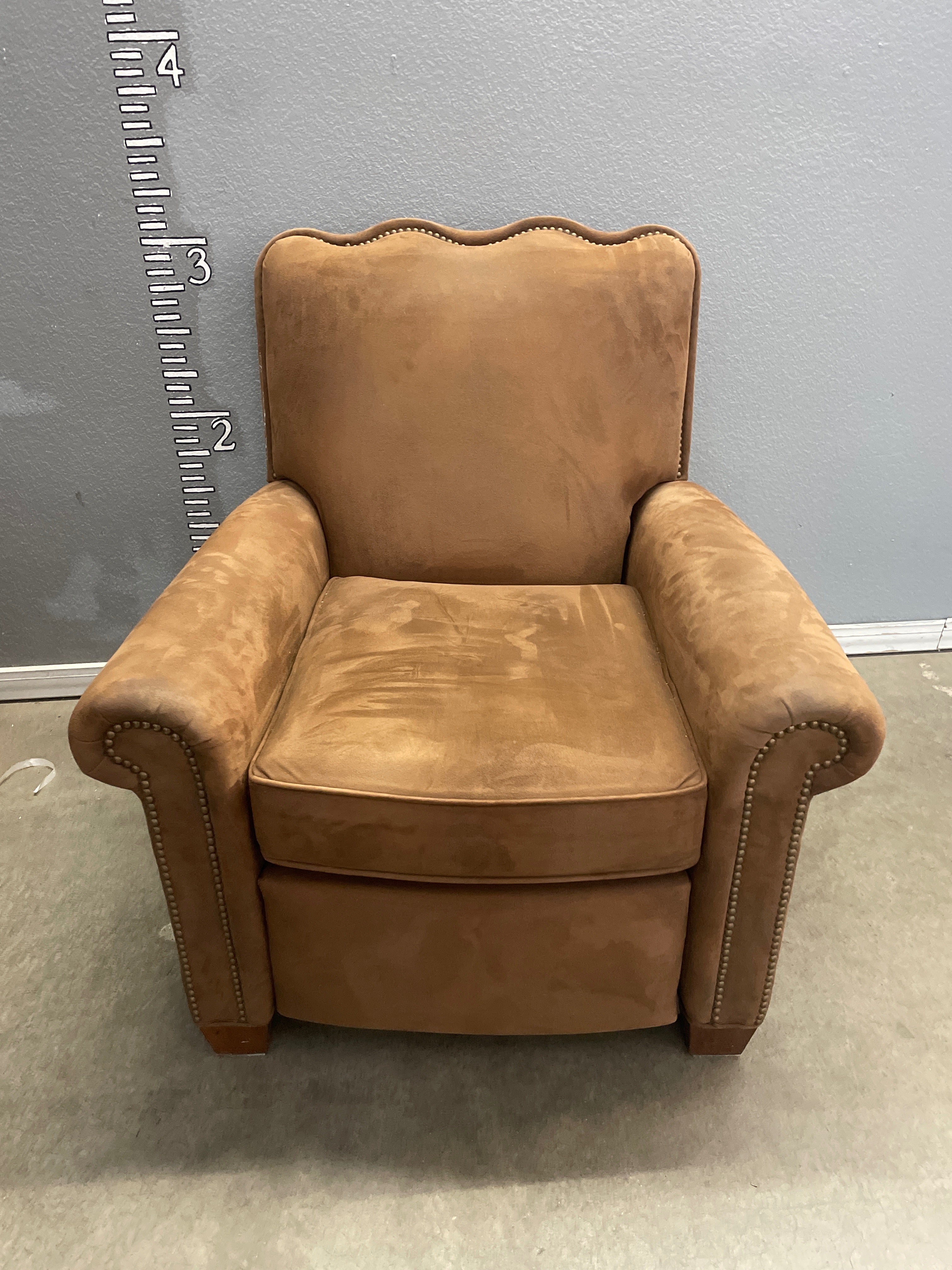 This cozy armchair features a plush tan suede fabric with classic nailhead trim accents, adding an elegant touch to any living space. Approximate Size: 3.5 x 2.5 x 2.5