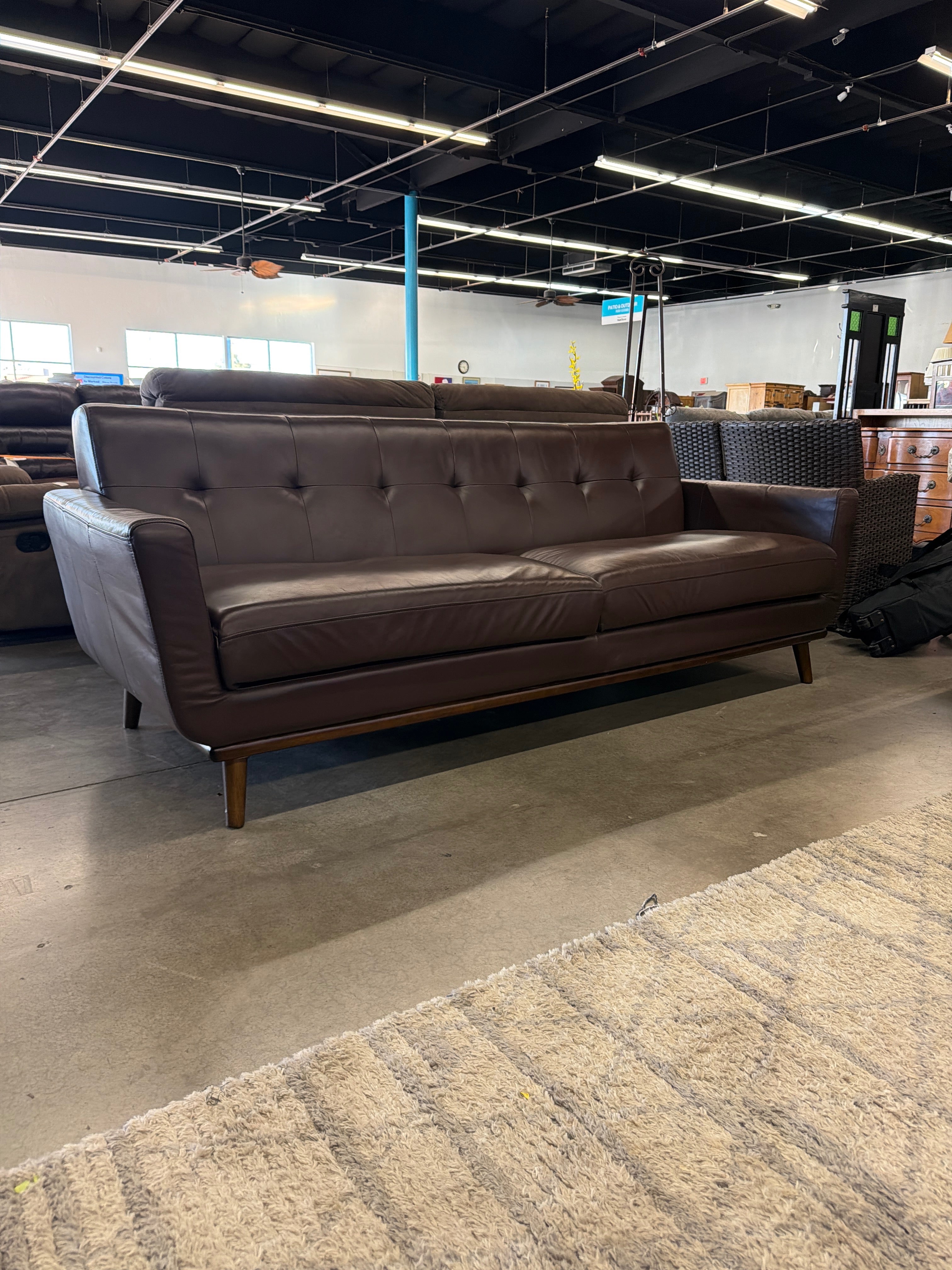 This sleek and stylish sofa features a rich brown leather finish, providing a sophisticated look for any living room. The durable leather upholstery is complemented by tufted back cushions and sturdy wooden legs. Approximate Size: 2.5 x 7 x 3