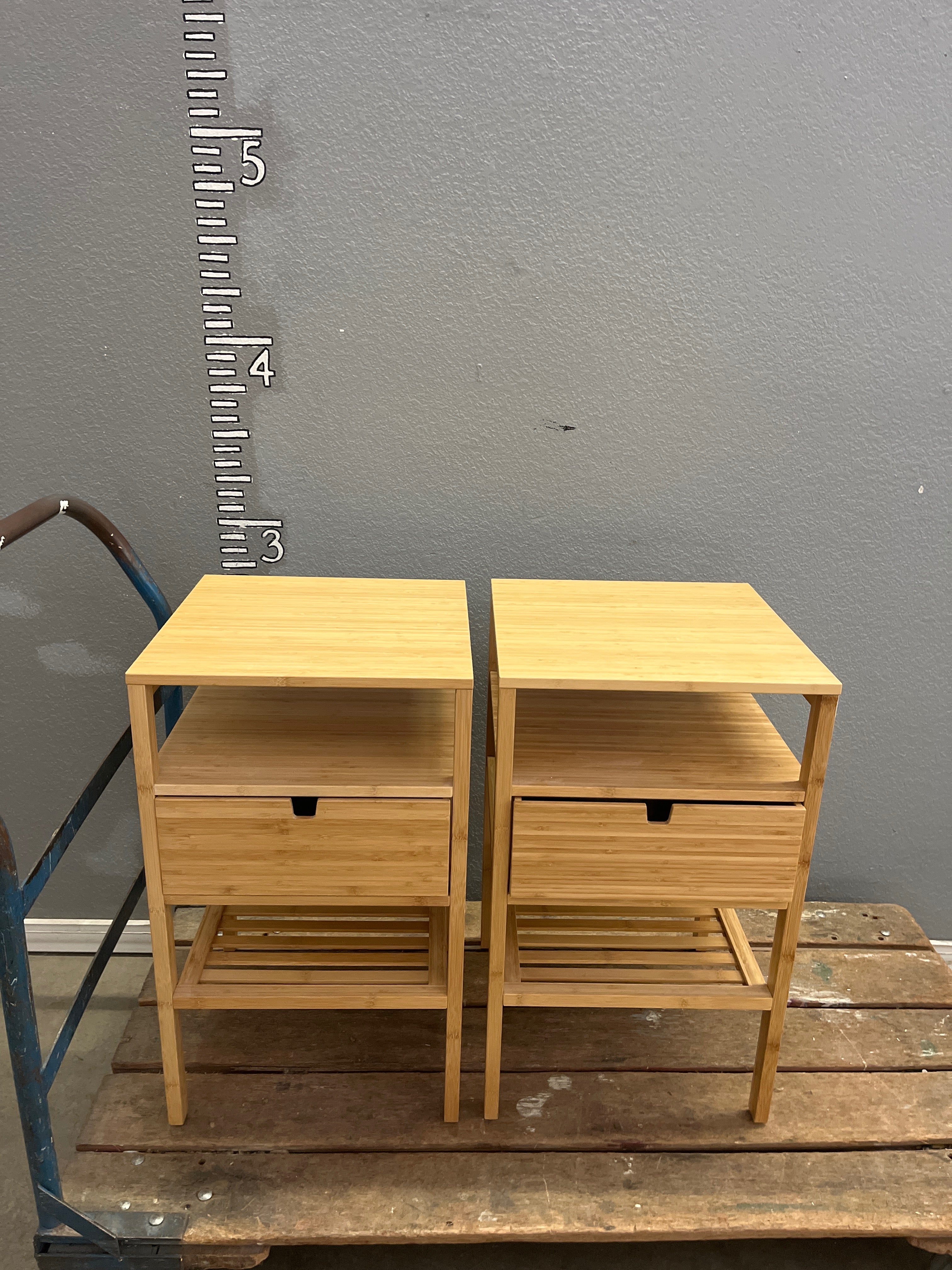This set of two bamboo bedside nightstands features a natural light wood finish. Each piece includes a convenient drawer and a lower shelf, offering ample storage space while adding a touch of minimalist elegance to any bedroom. Approximate Size: 2.5 x 1.3 x 1.3
