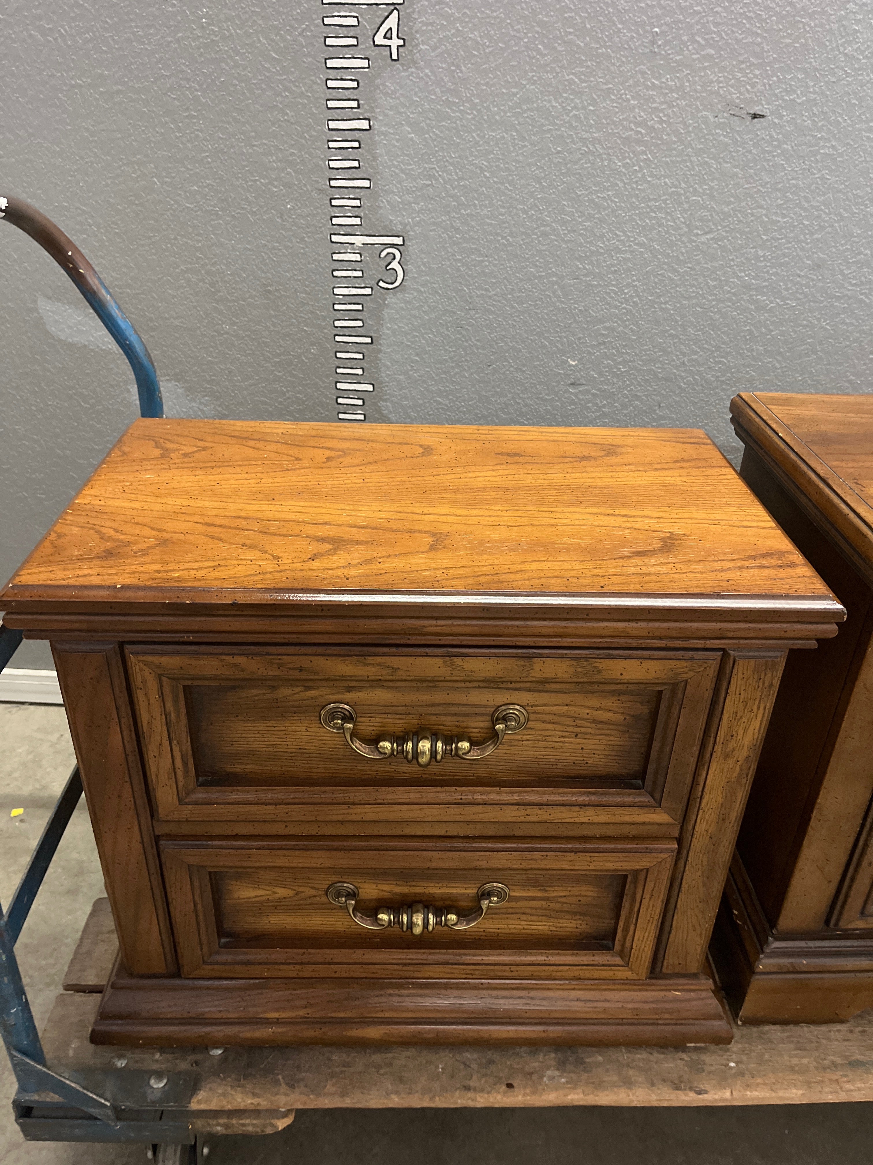 This elegant nightstand features a rich brown wood finish, complemented by ornate brass handles. Perfect for adding a touch of classic style to your bedroom decor. Approximate Size: 2 x 2 x 1.5