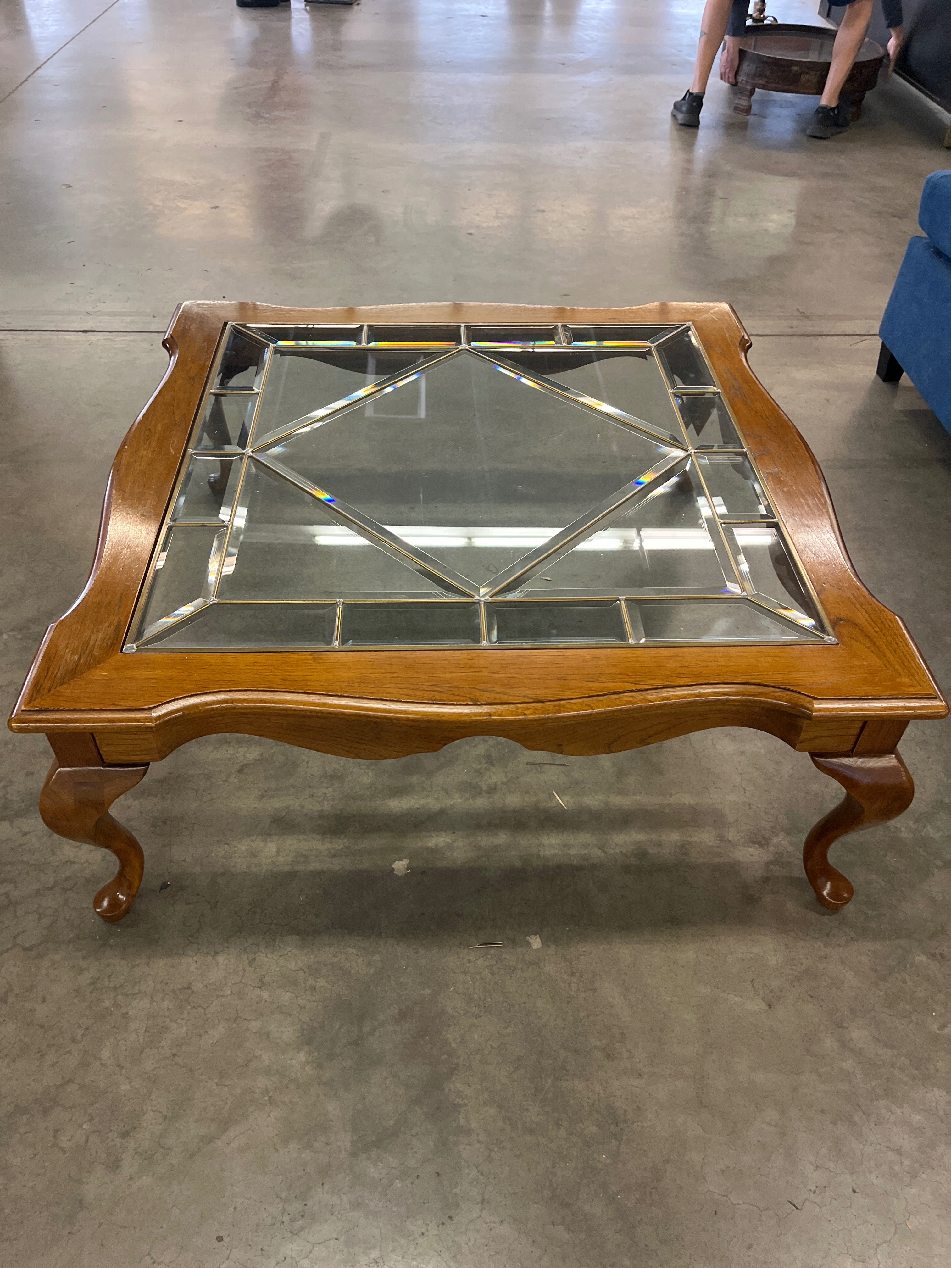 A beautifully crafted coffee table featuring a glass top with intricate geometric patterns. The table boasts a rich cherry wood finish, providing an elegant and classic look suitable for any living room. The sturdy wooden legs offer both stability and style. Approximate Size: 1.5 x 3 x 3