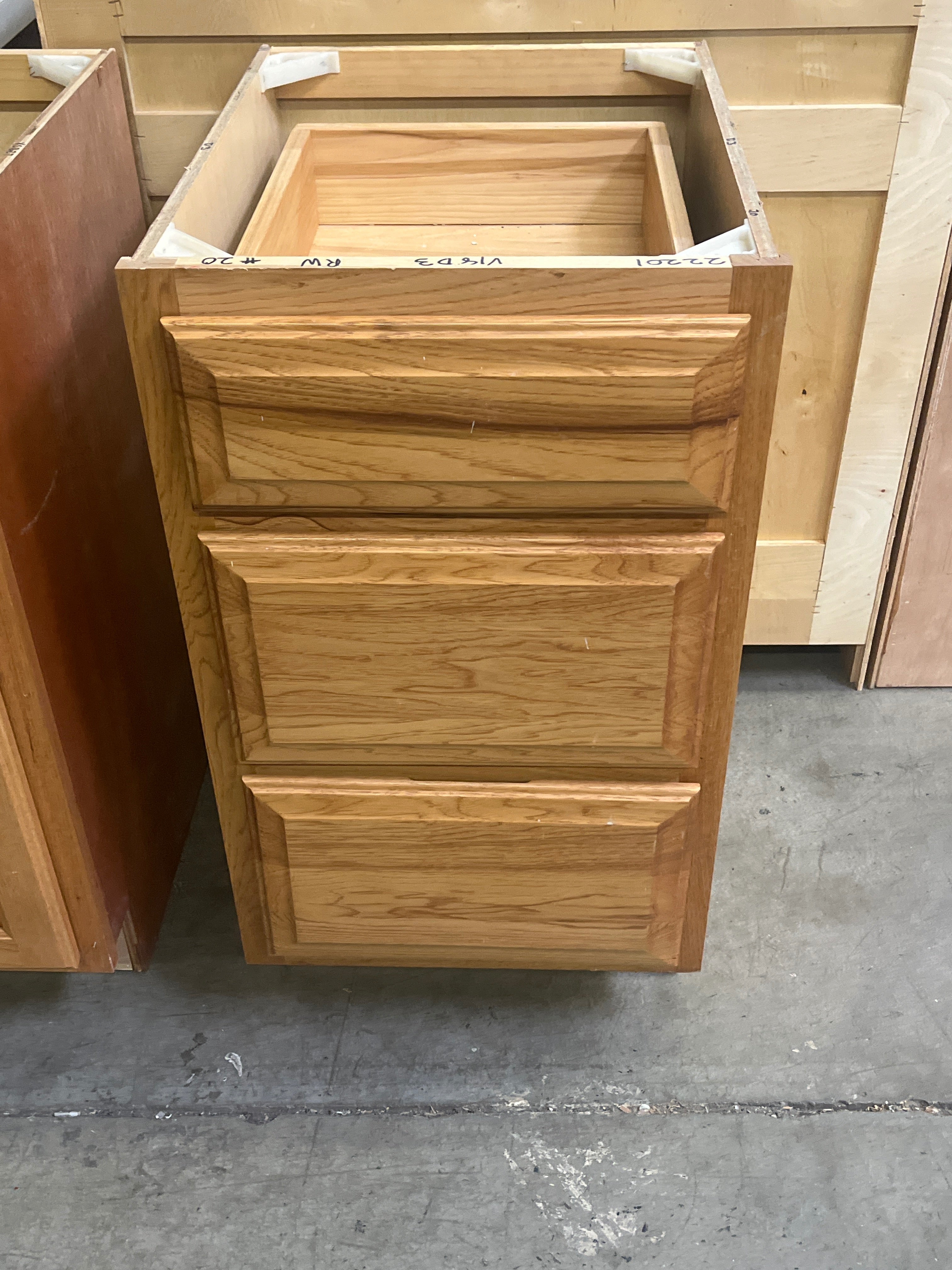 This oak base cabinet features a natural wood finish and includes three spacious drawers. The cabinet offers durability and a classic aesthetic, perfect for organizing kitchen essentials. Approximate Size: 3 x 2 x 2