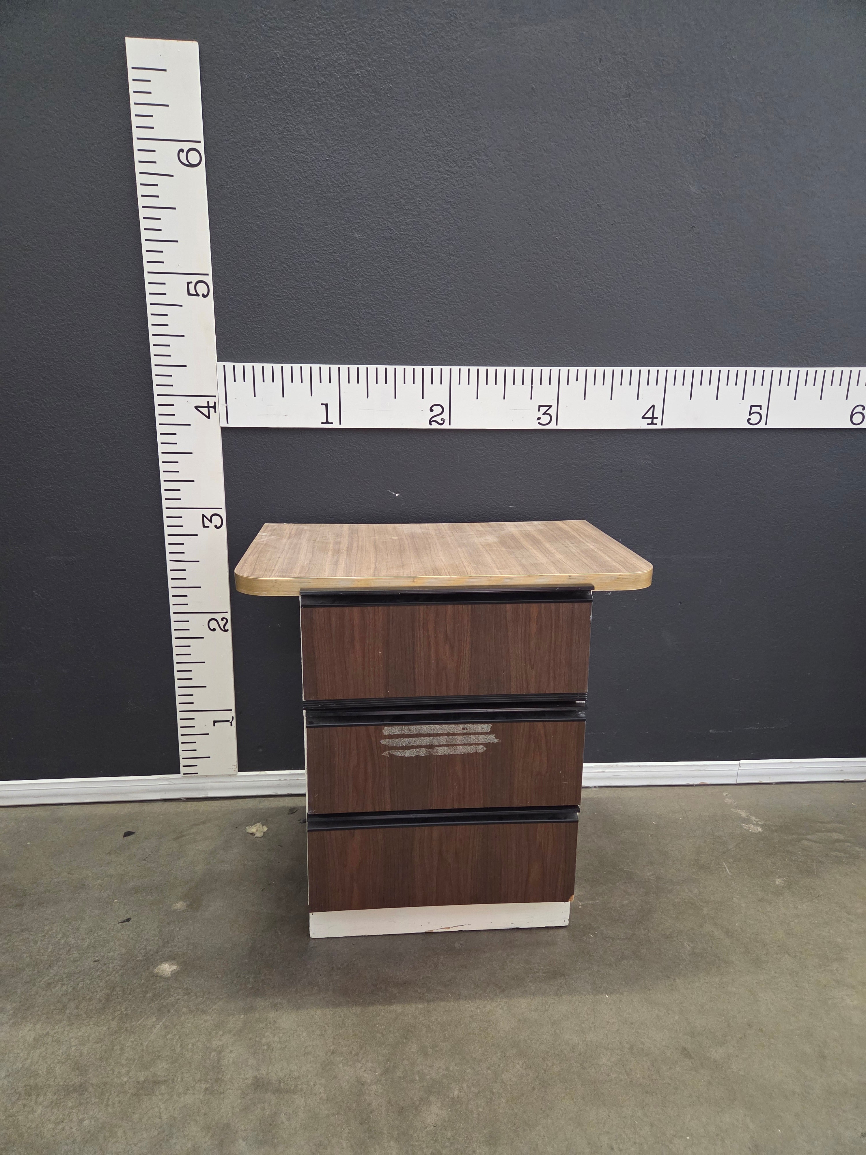 This filing cabinet features a classic wood veneer finish in a rich brown color, providing a timeless and sturdy storage solution. The smooth surface and compact design make it a perfect fit for any office. Approximate Size: 2.5 x 1.5 x 1.5