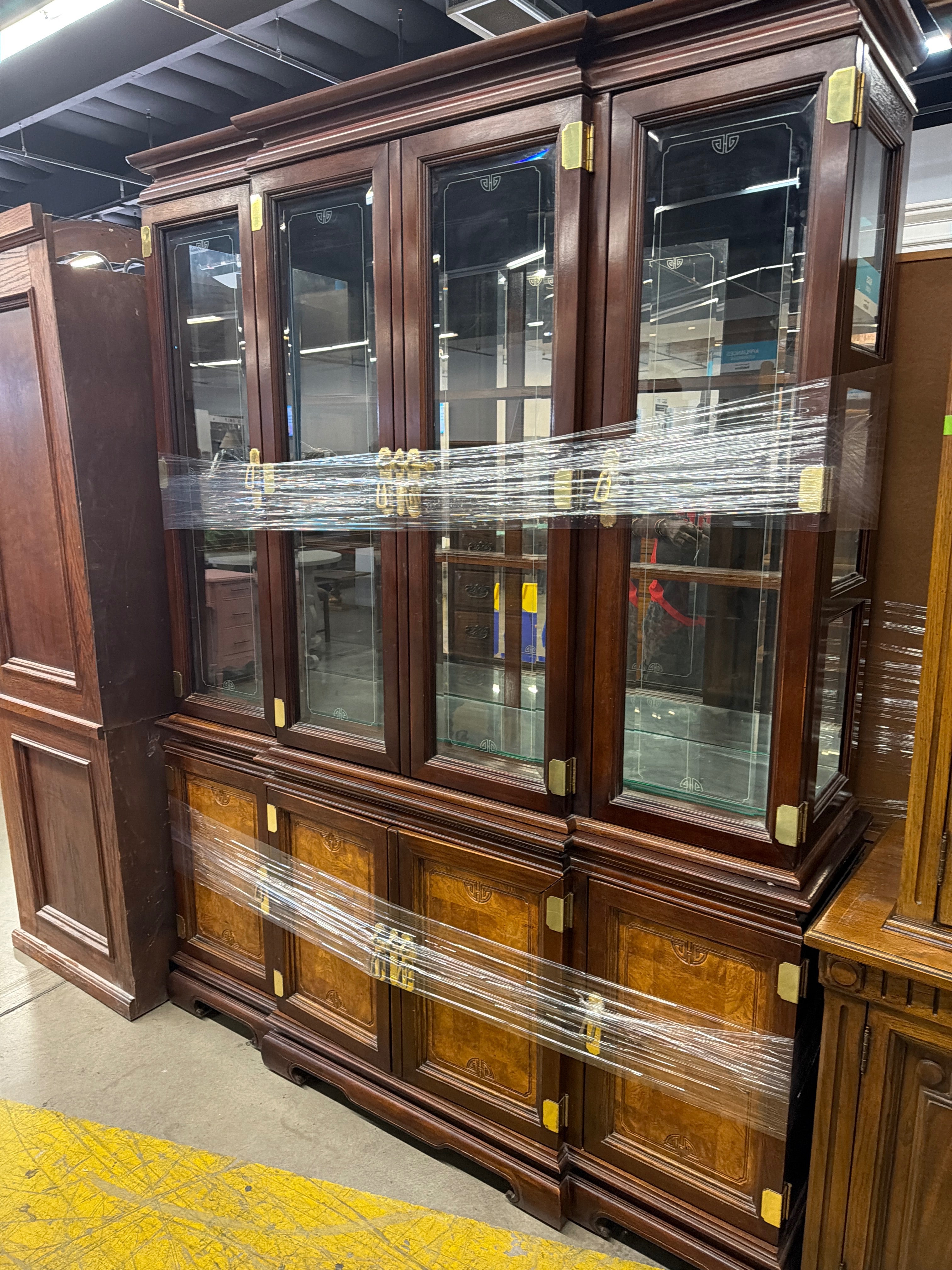 This classic display cabinet features a rich mahogany finish with clear glass doors for showcasing your favorite collectibles. The cabinet's lower section adds functional storage with solid wood doors. Perfect for adding sophistication to any dining room or living space. Approximate Size: 7 x 5 x 2
