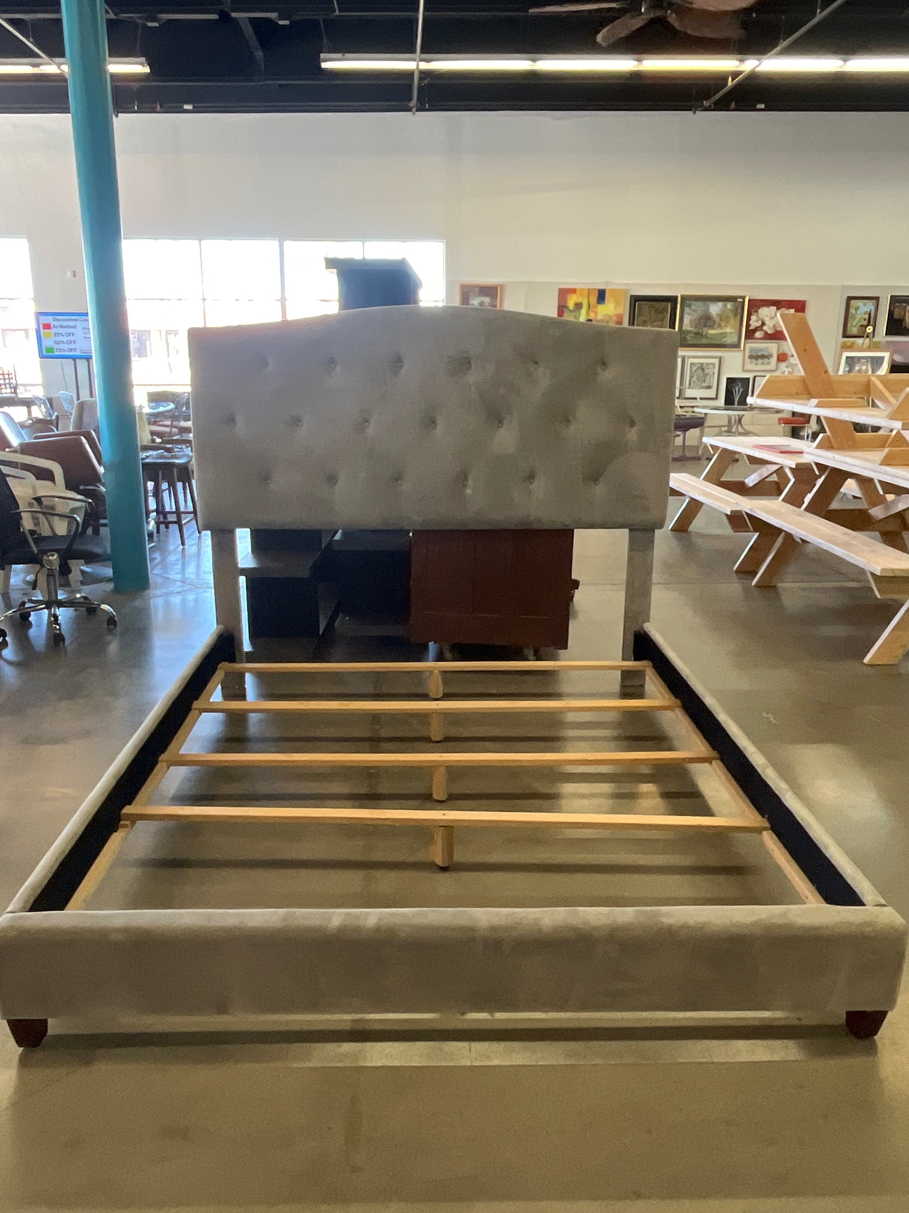 This luxurious bed frame features a soft gray velvet upholstery with a sophisticated tufted finish, adding a touch of elegance to your bedroom décor. Approximate Size: 4 x 5.5 x 7