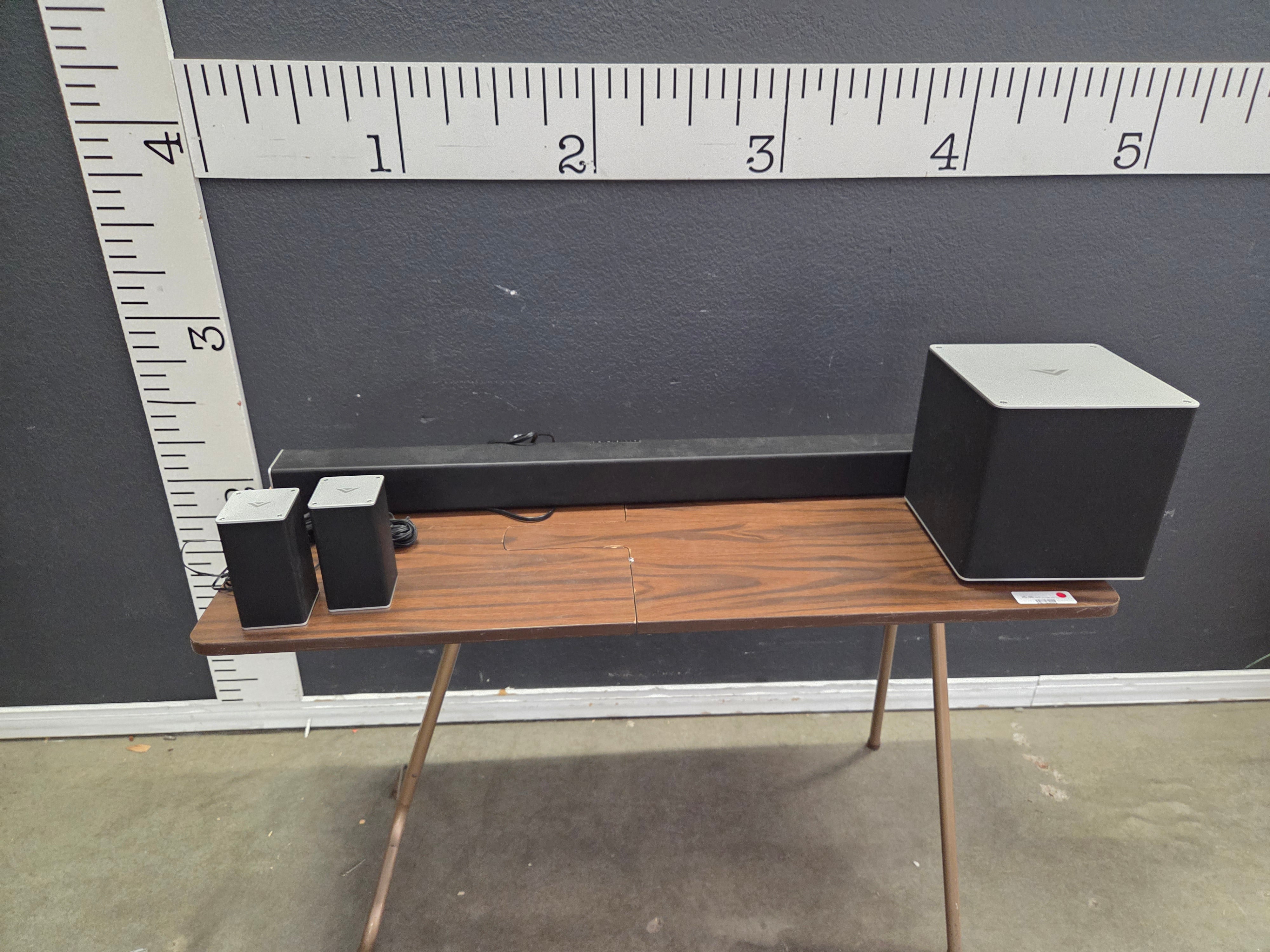 This sleek black sound system includes a soundbar, two satellite speakers, and a subwoofer, all featuring a modern matte finish. Perfect for enhancing your television or movie experience with high-quality sound. Approximate Size: 0.5 x 4 x 0.5