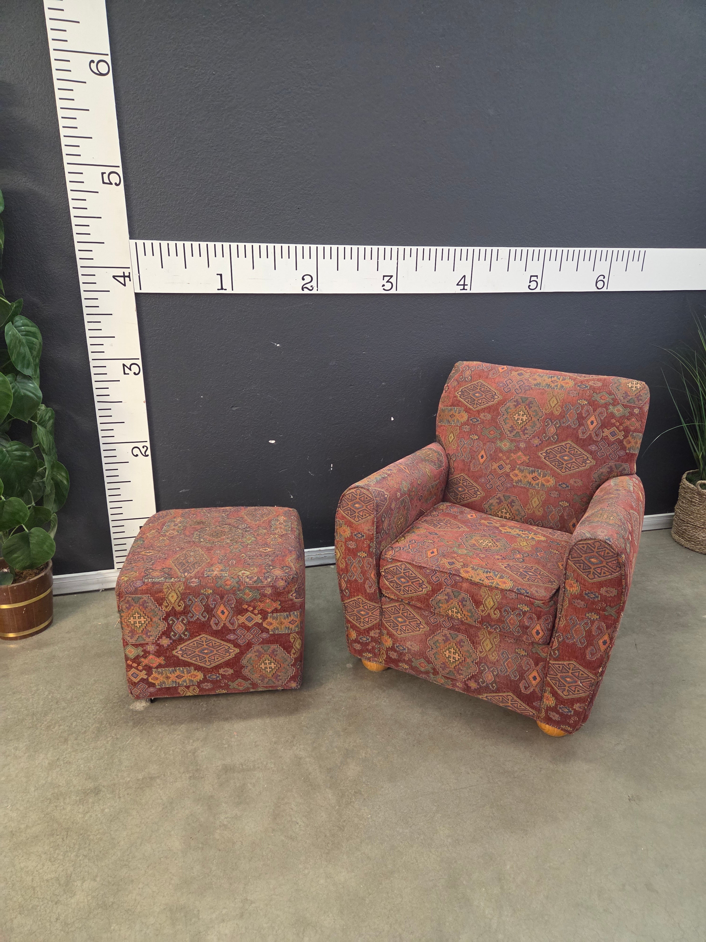 This cozy armchair and ottoman set features a warm, multicolor patterned fabric with a soft, cushioned finish. The intricate design adds a touch of classic charm to any space. Approximate Size: 2.5 x 2 x 2