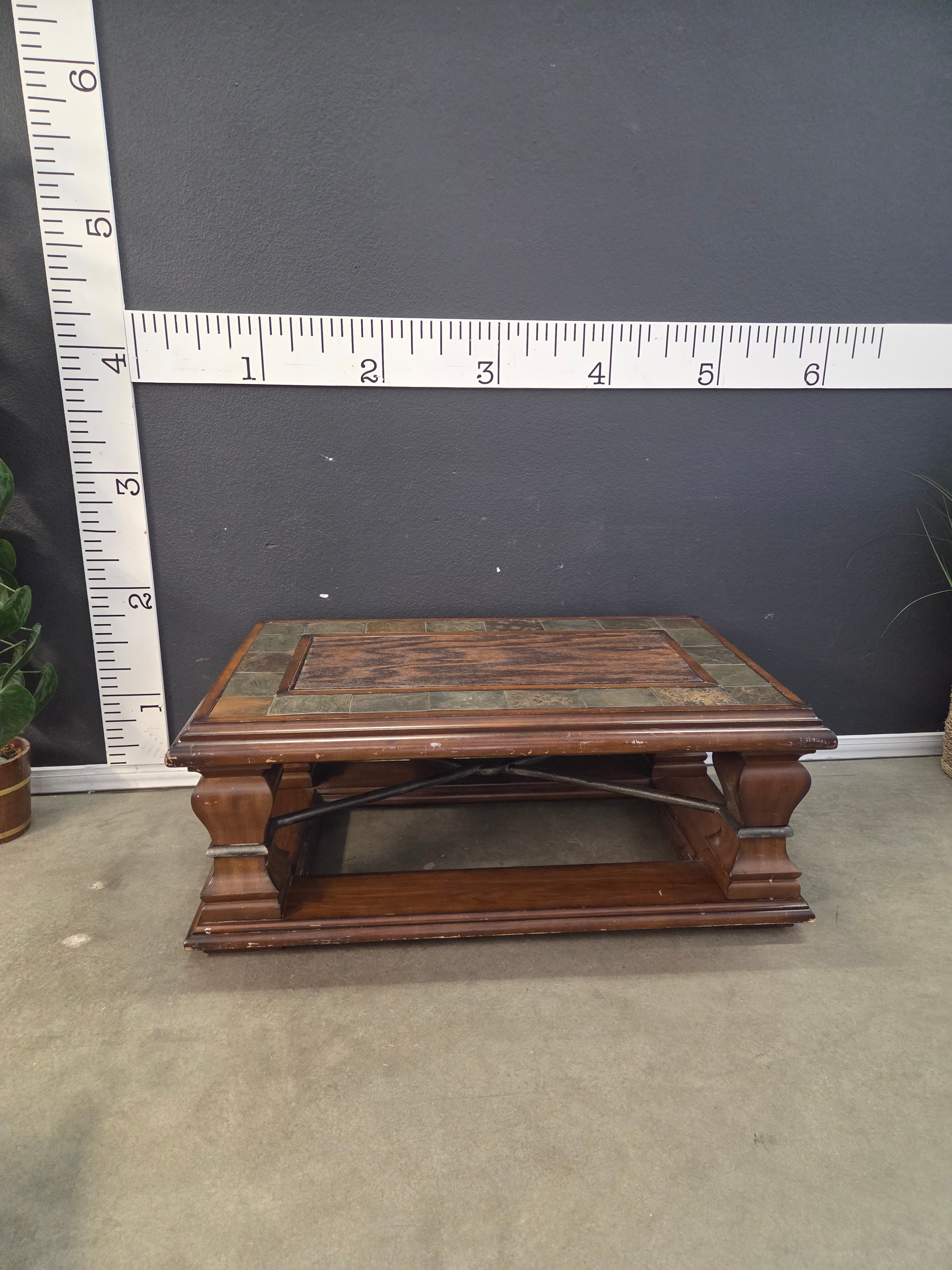 This elegant coffee table features a rich brown wood finish complemented by a unique slate inlay on the tabletop. Its robust construction and classic design make it a timeless piece suitable for any living room setting. Approximate Size: 1.5 x 3 x 2