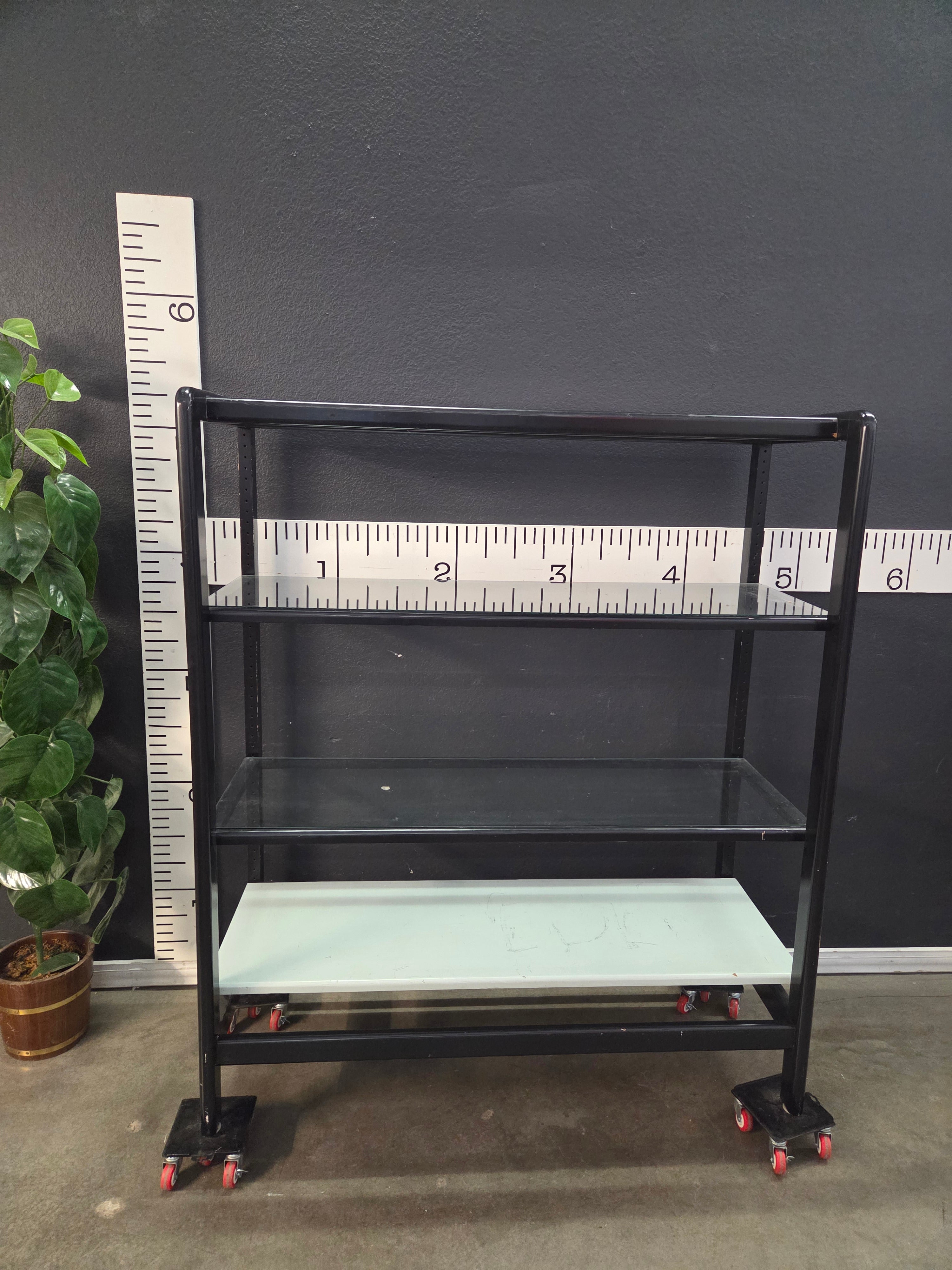This sleek cart features a sturdy black metal frame with a smooth finish. It is equipped with three shelves, two of which are transparent and one opaque. Approximate Size: 3 x 2 x 1