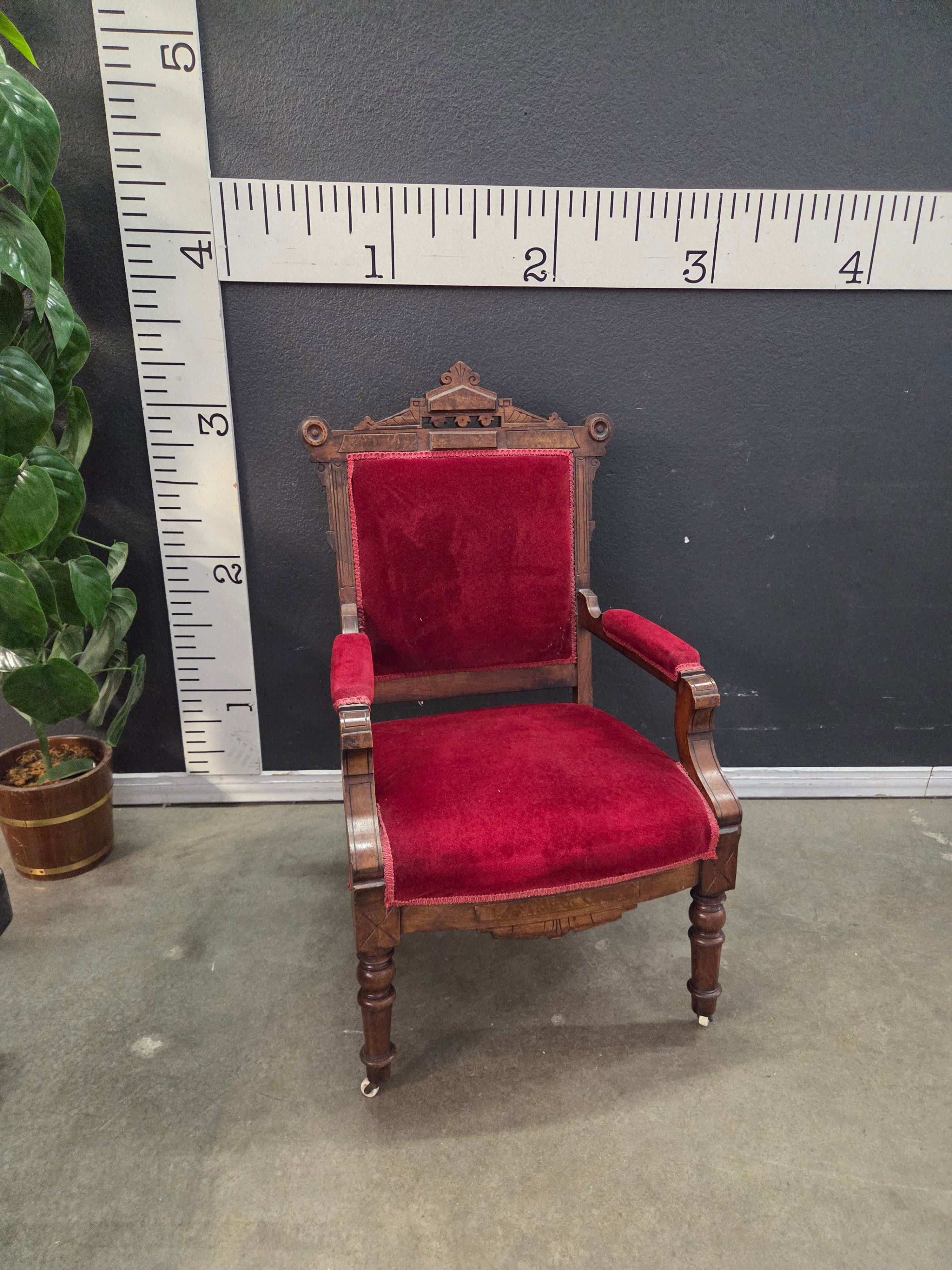 This vintage armchair features a rich mahogany wooden frame with intricate carvings and is upholstered in a plush red velvet fabric. The elegant design and comfortable seating make it an ideal centerpiece for a traditional living room. Approximate Size: 4 x 2 x 2