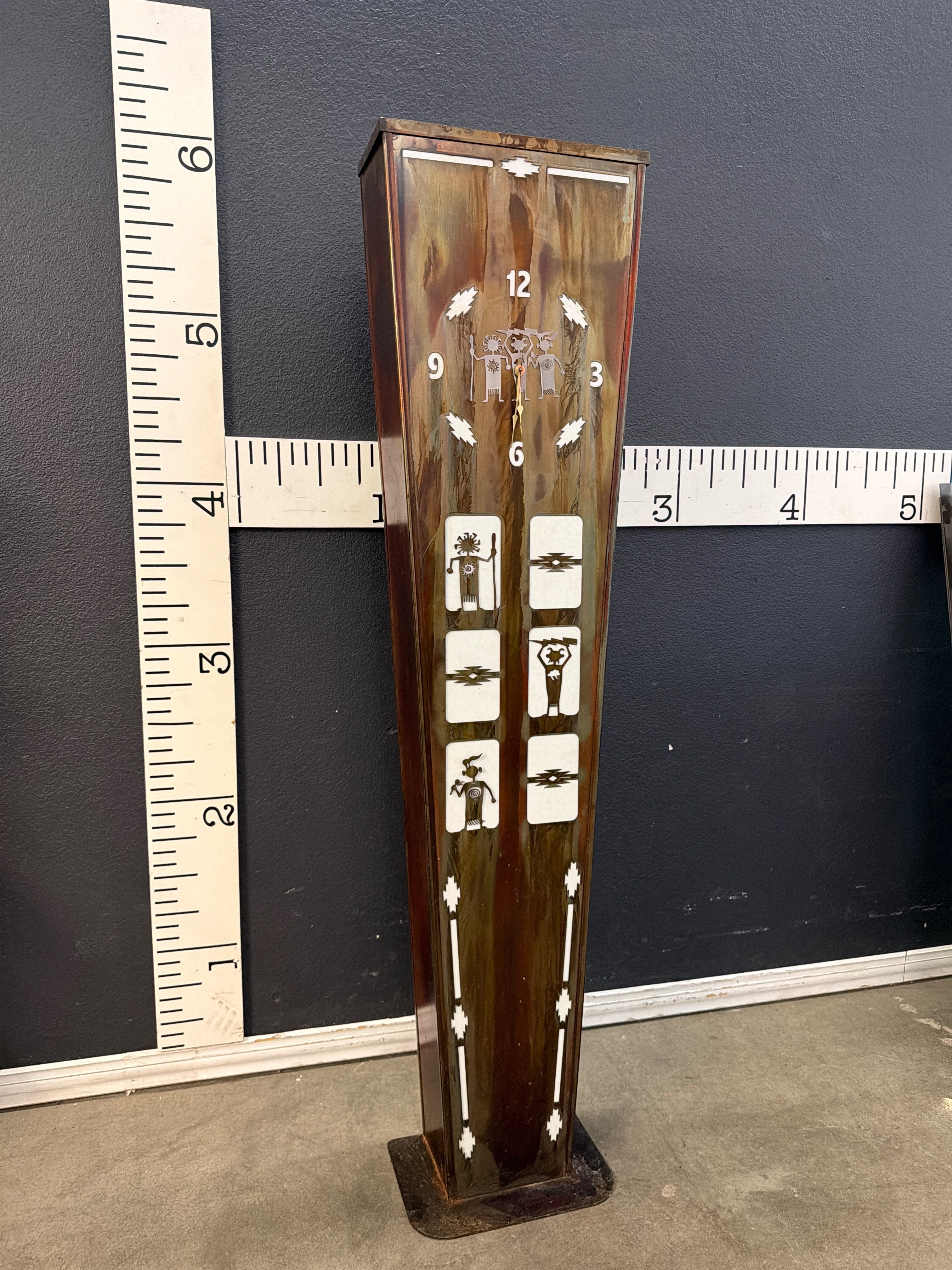 This vintage wooden pendulum wall clock features a rich, dark wood finish with intricate white inlay designs. Its tall, slim profile adds an elegant touch to any room. The clock's distinctive patterns and classic aesthetic make it a unique addition to your décor. Approximate Size: 4 x 1 x 1