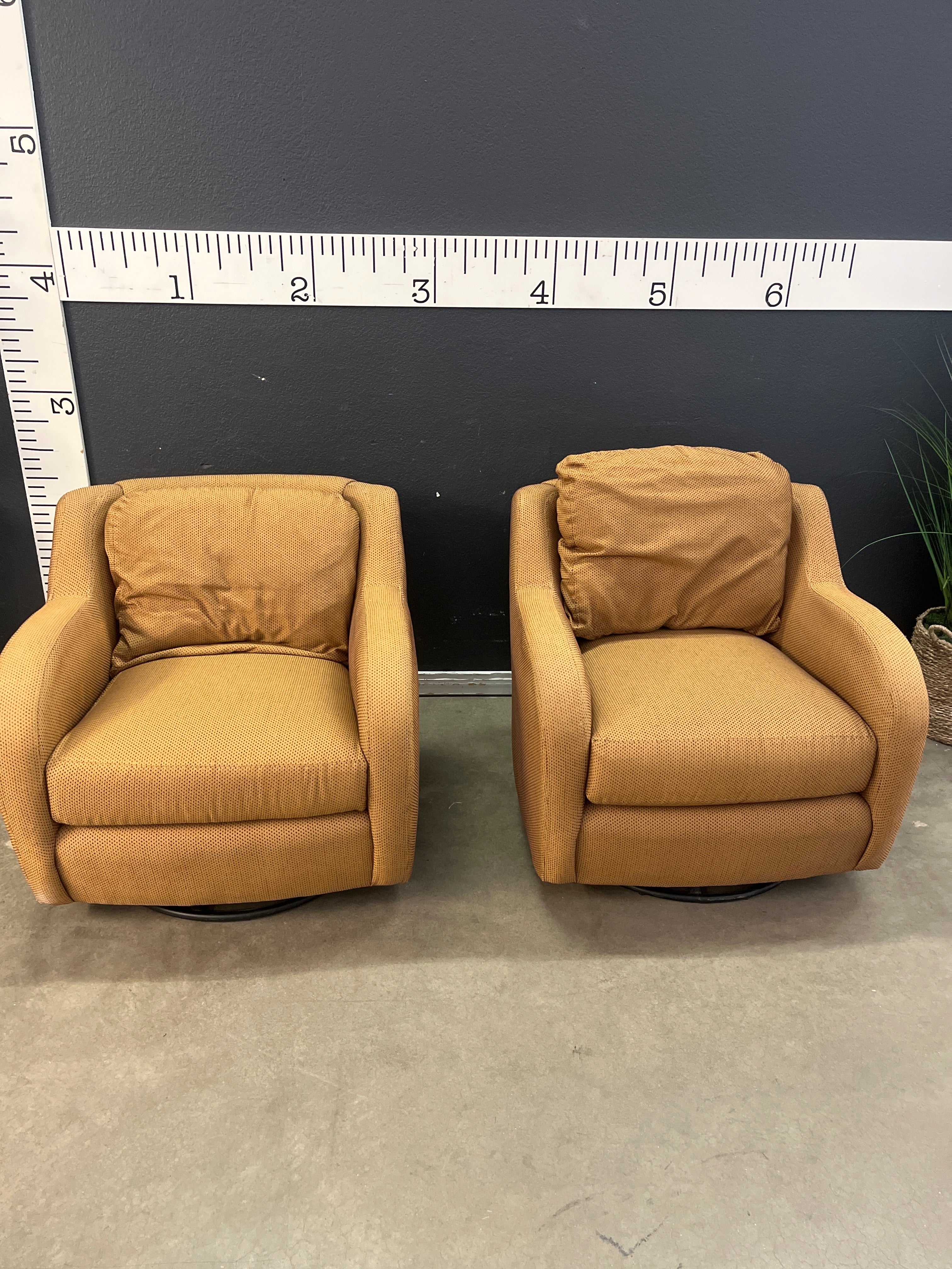 These vintage swivel club chairs feature a warm mustard color fabric with a textured finish. With their comfortable design and mid-century appeal, they are perfect for adding a retro touch to your living space. Approximate Size: 2.5 x 2.5 x 2.5