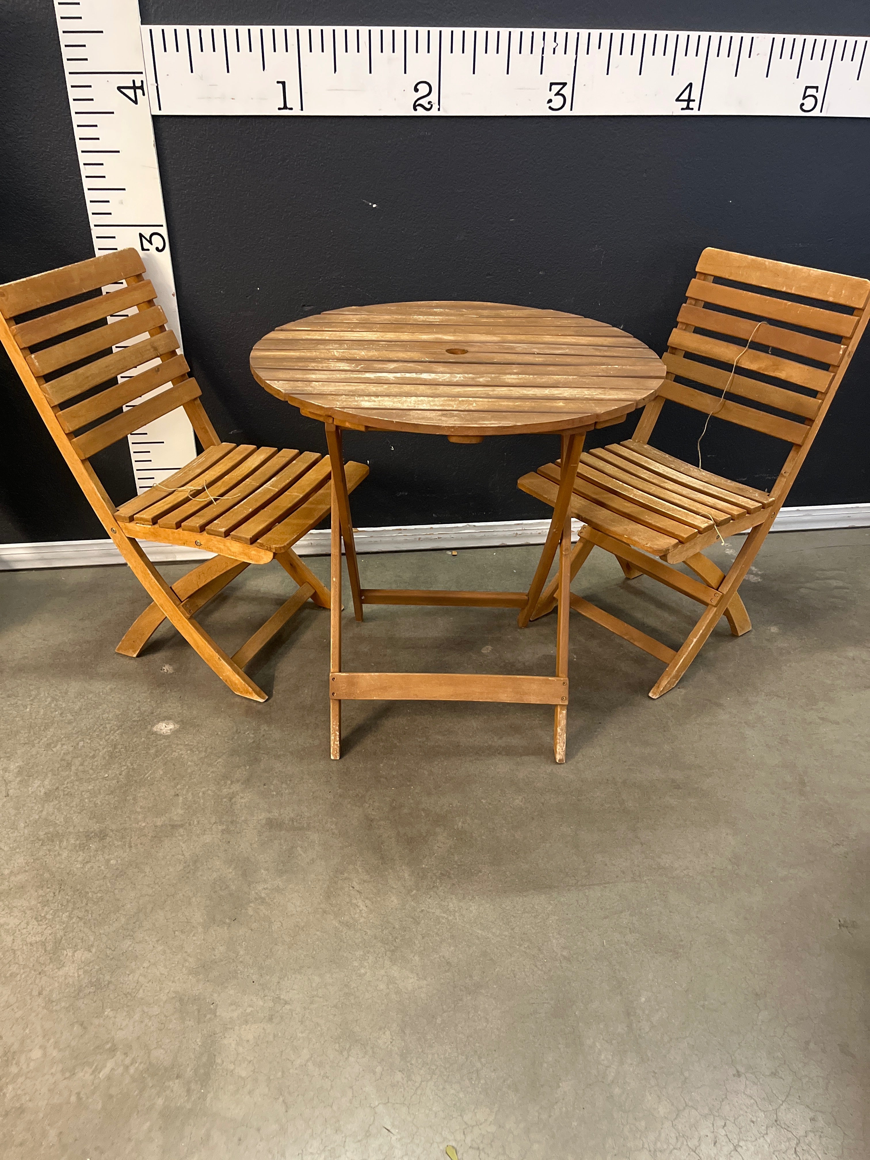 This charming bistro set features a round wooden table and two matching chairs, perfect for a cozy outdoor space. The set is crafted from a warm, natural wood finish that adds a rustic touch to any patio or garden setting. Approximate Size: 3 x 2 x 2