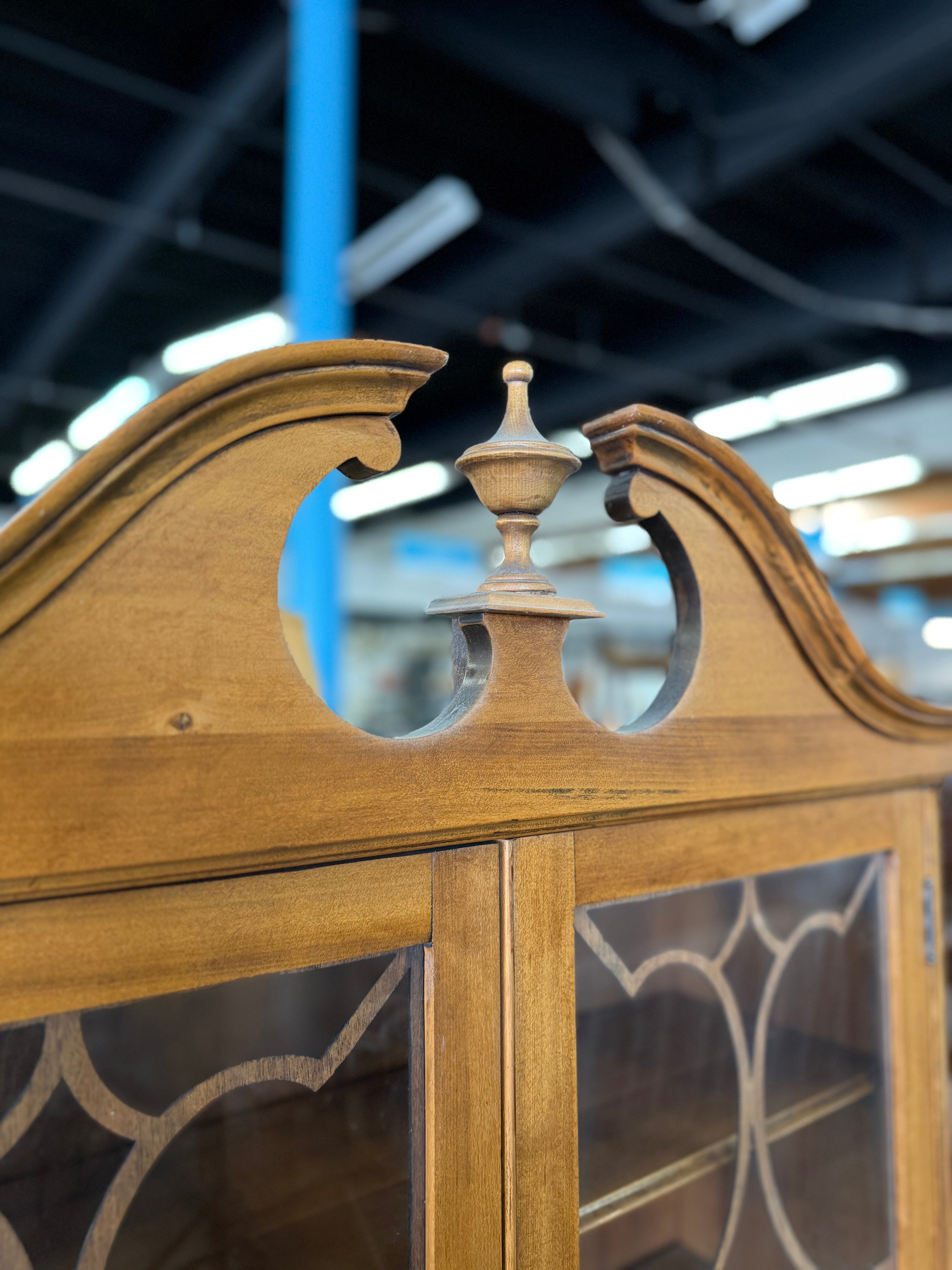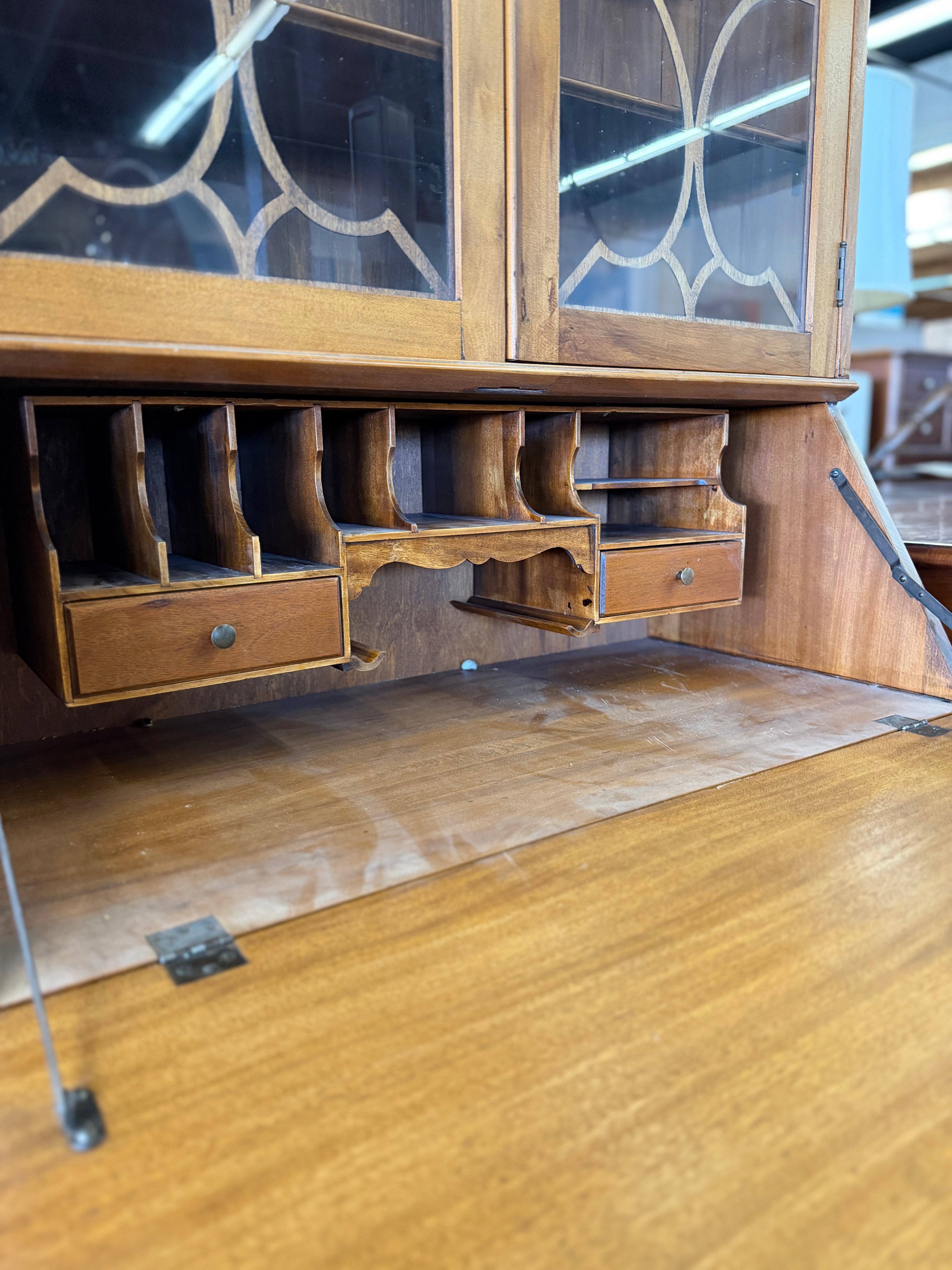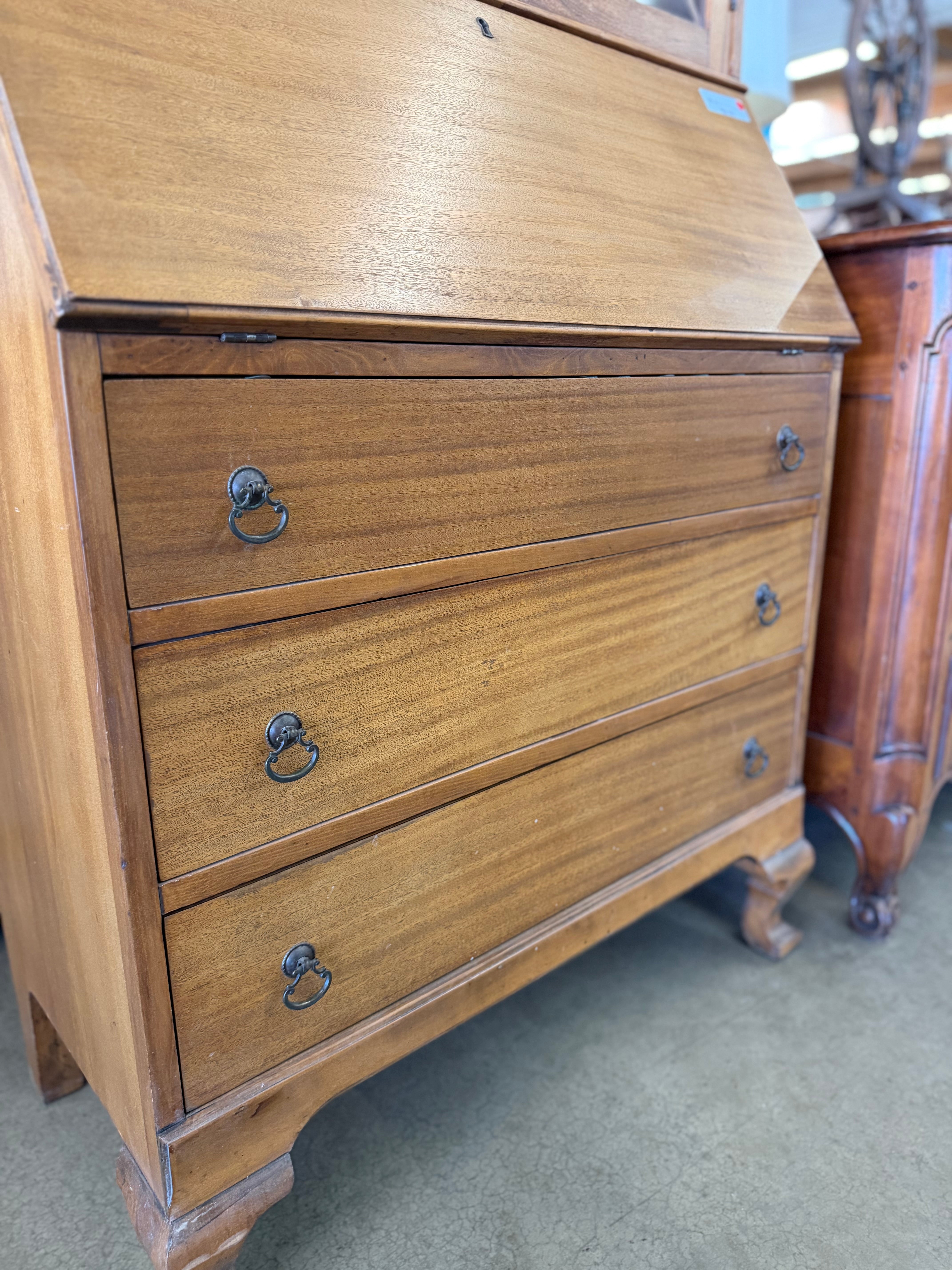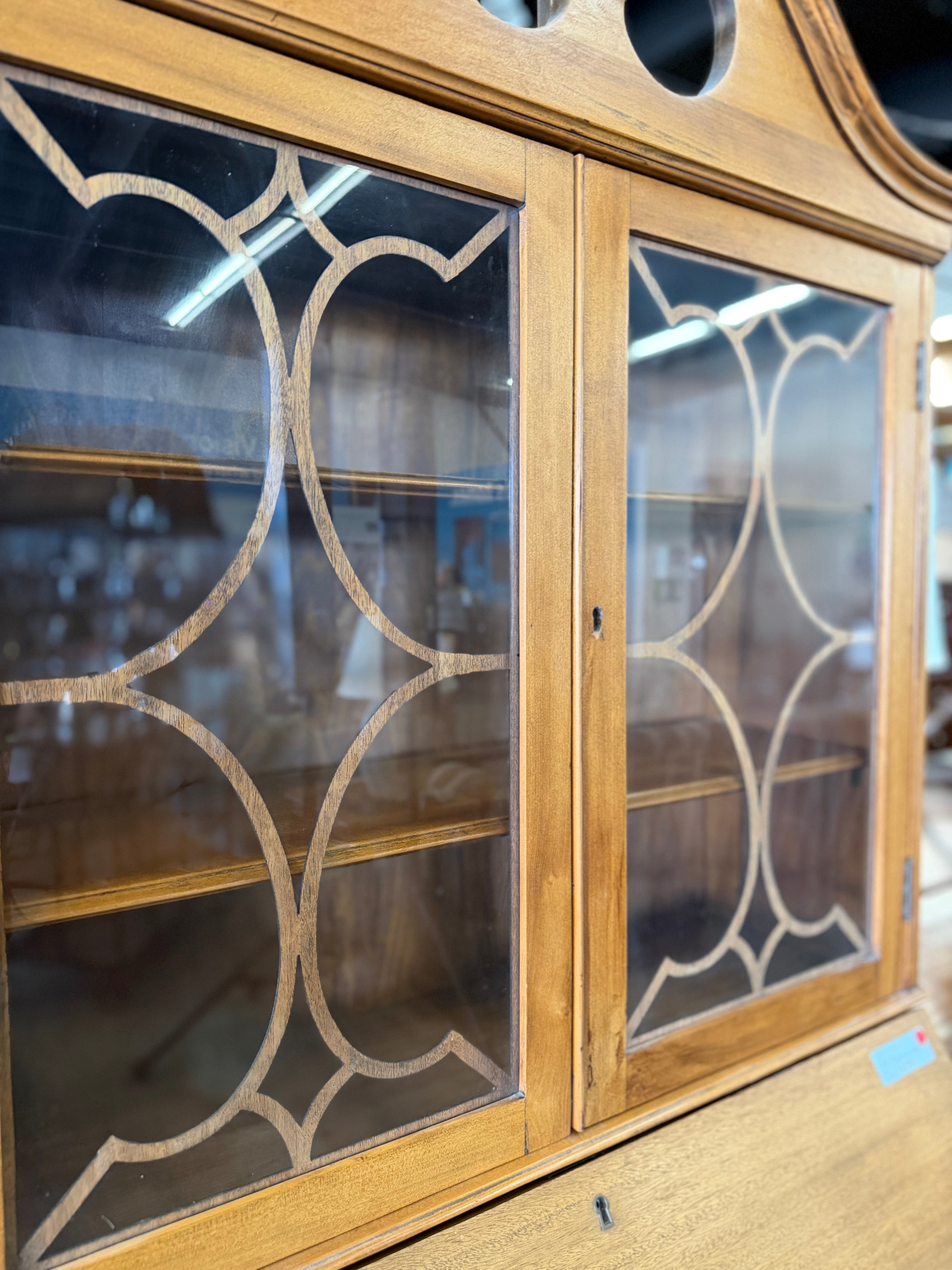This elegant vintage secretary desk features a warm brown wood finish with a glass-paneled hutch. The intricate woodwork on the glass doors adds a touch of classic charm to any room. Approximate Size: 6.5 x 3 x 1.5