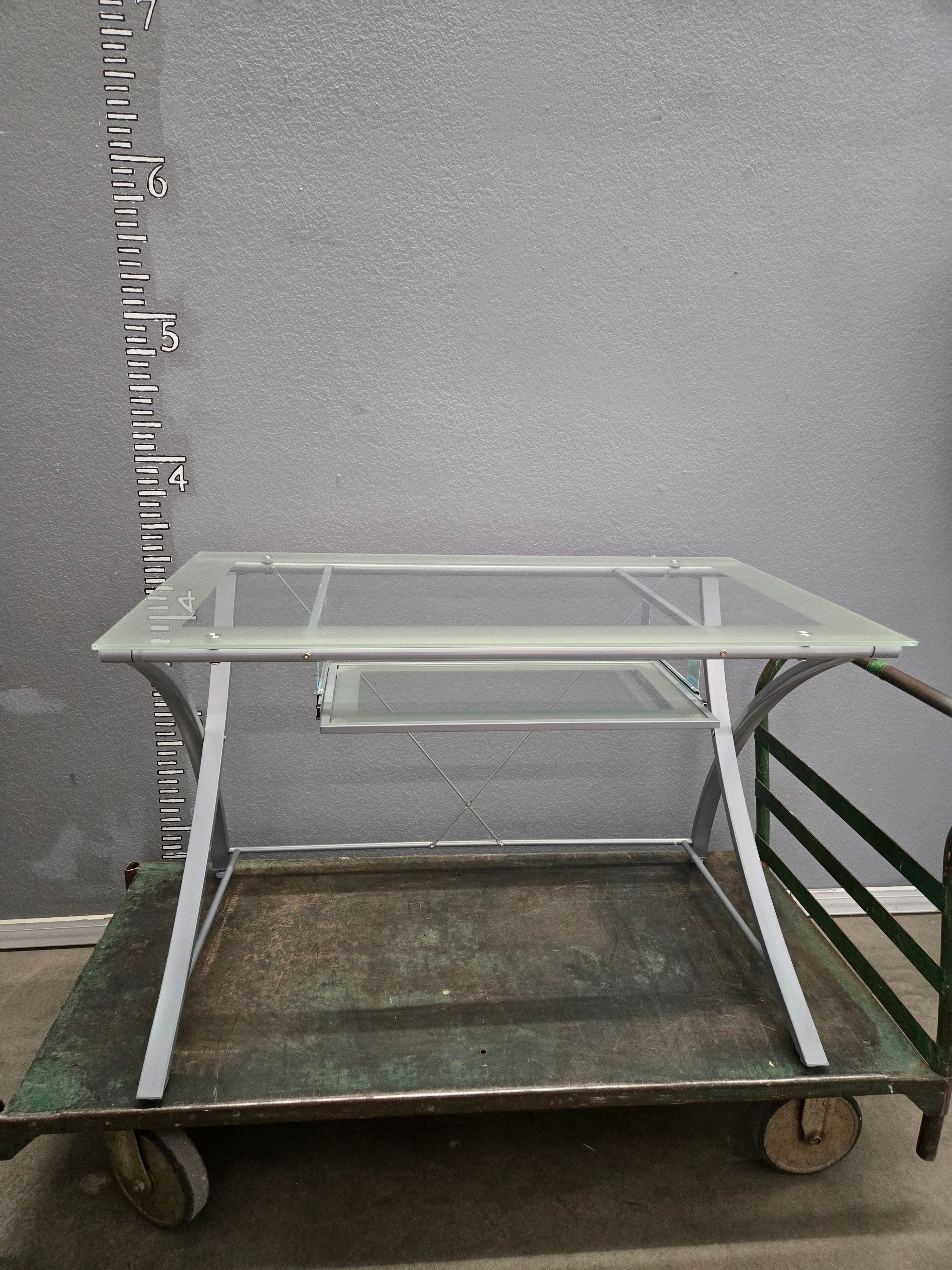 This sleek desk features a tempered glass top with a silver metal frame, giving it a modern and minimalist look. Perfect for any office or study space, it includes a pull-out keyboard tray for added functionality. Approximate Size: 3 x 4 x 2