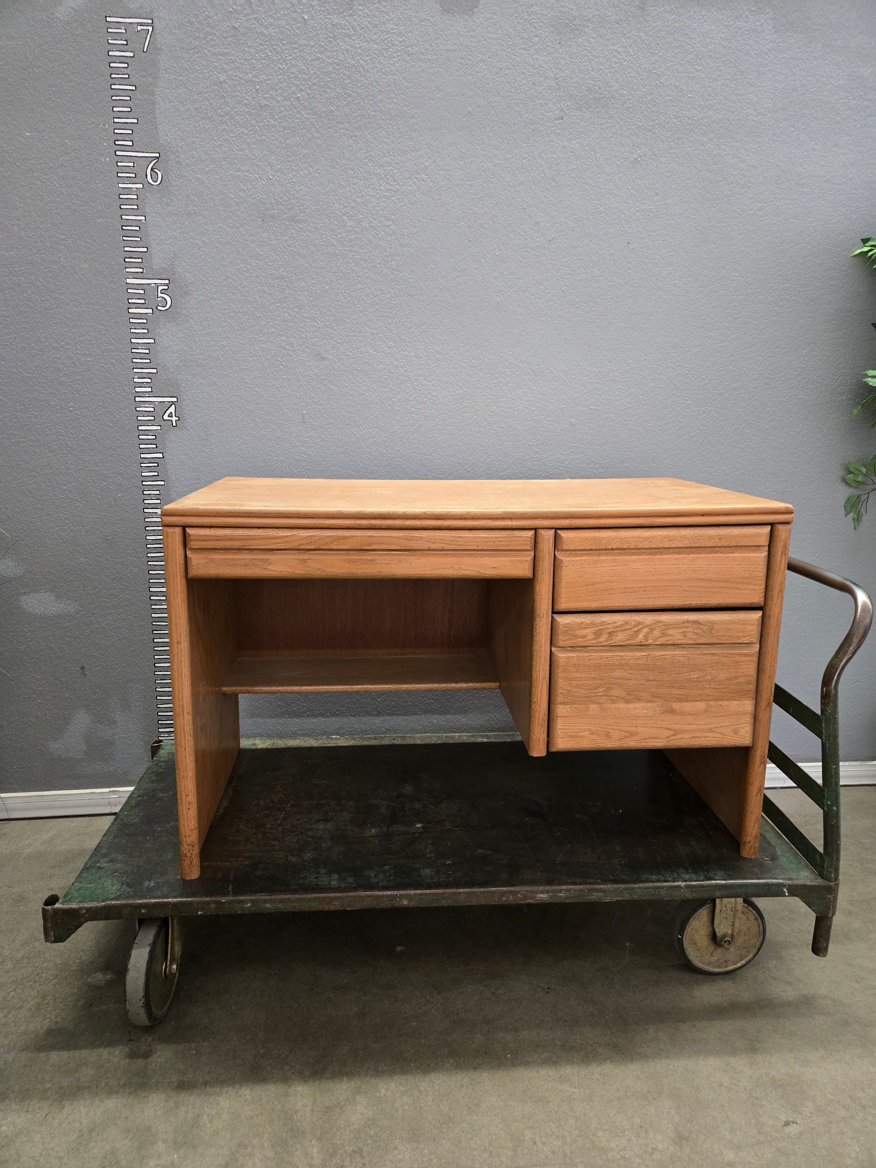 This vintage wooden desk features a natural oak finish, providing a classic look. It comes with two spacious storage drawers, perfect for keeping your office essentials organized. Approximate Size: 3 x 3.5 x 2