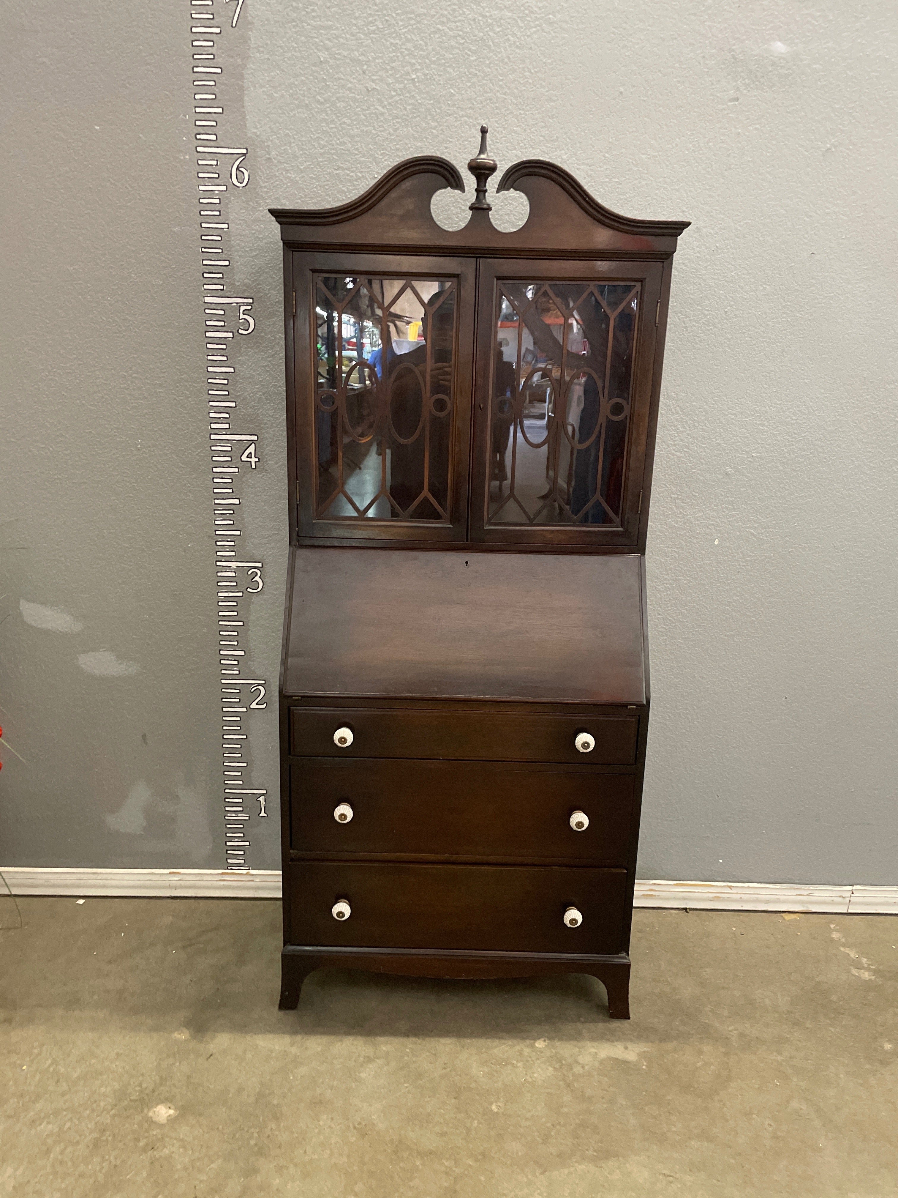 This elegant secretary desk features a rich dark wood finish with a smooth texture and glass-paneled hutch doors. The traditional design is complemented by white ceramic knobs that add a touch of classic charm. Approximate Size: 6 x 3 x 1.5
