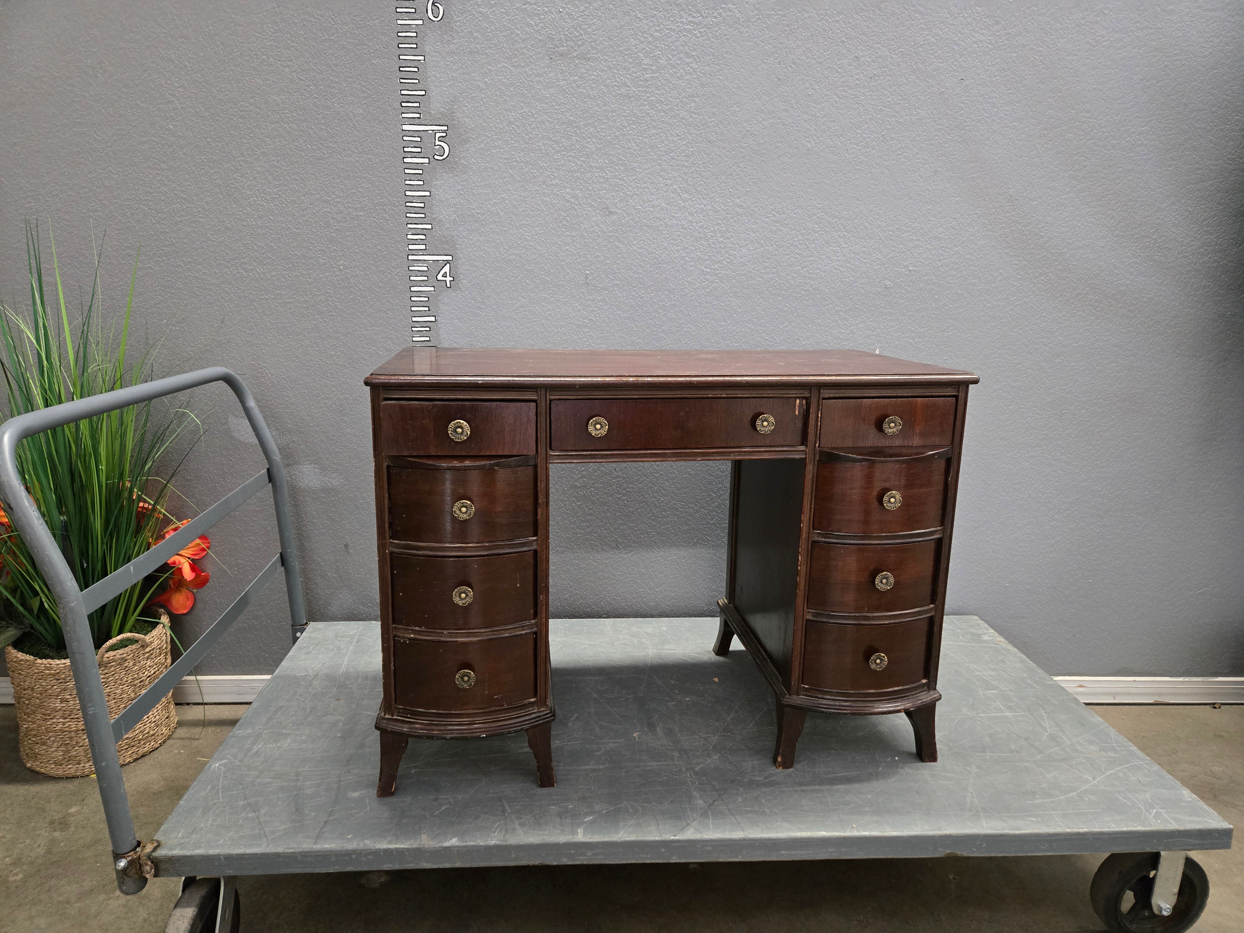 This elegant antique vanity desk features a rich mahogany finish that adds a touch of sophistication to any space. It includes beautifully curved drawer fronts with vintage brass handles. Perfect for adding a classic charm to your room. Approximate Size: 2.5 x 4 x 1.5