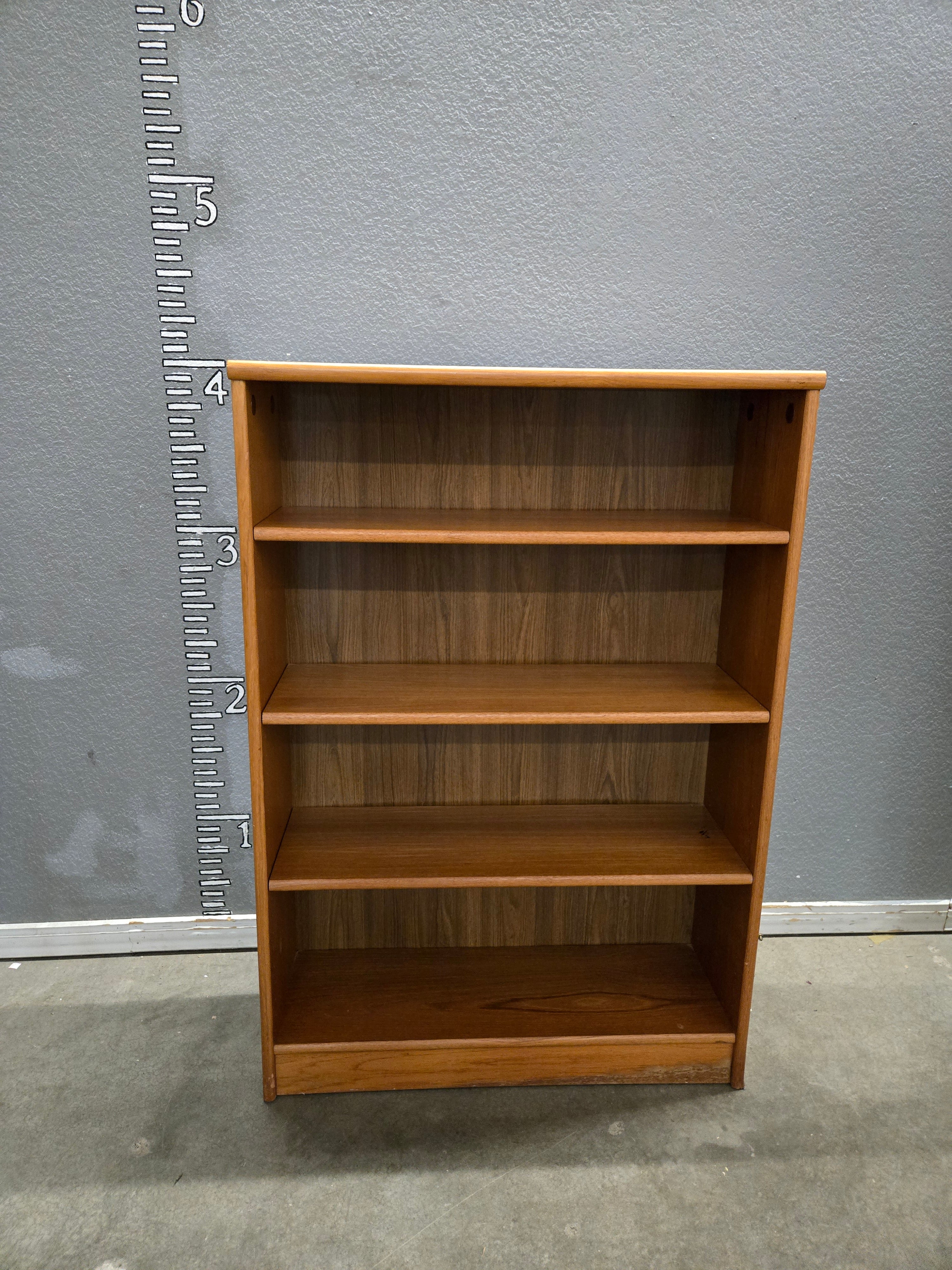 This wooden bookcase features a natural brown finish, offering a classic and sturdy design perfect for organizing books and decor. With adjustable shelves, it accommodates various item sizes. Approximate Size: 4 x 3 x 1