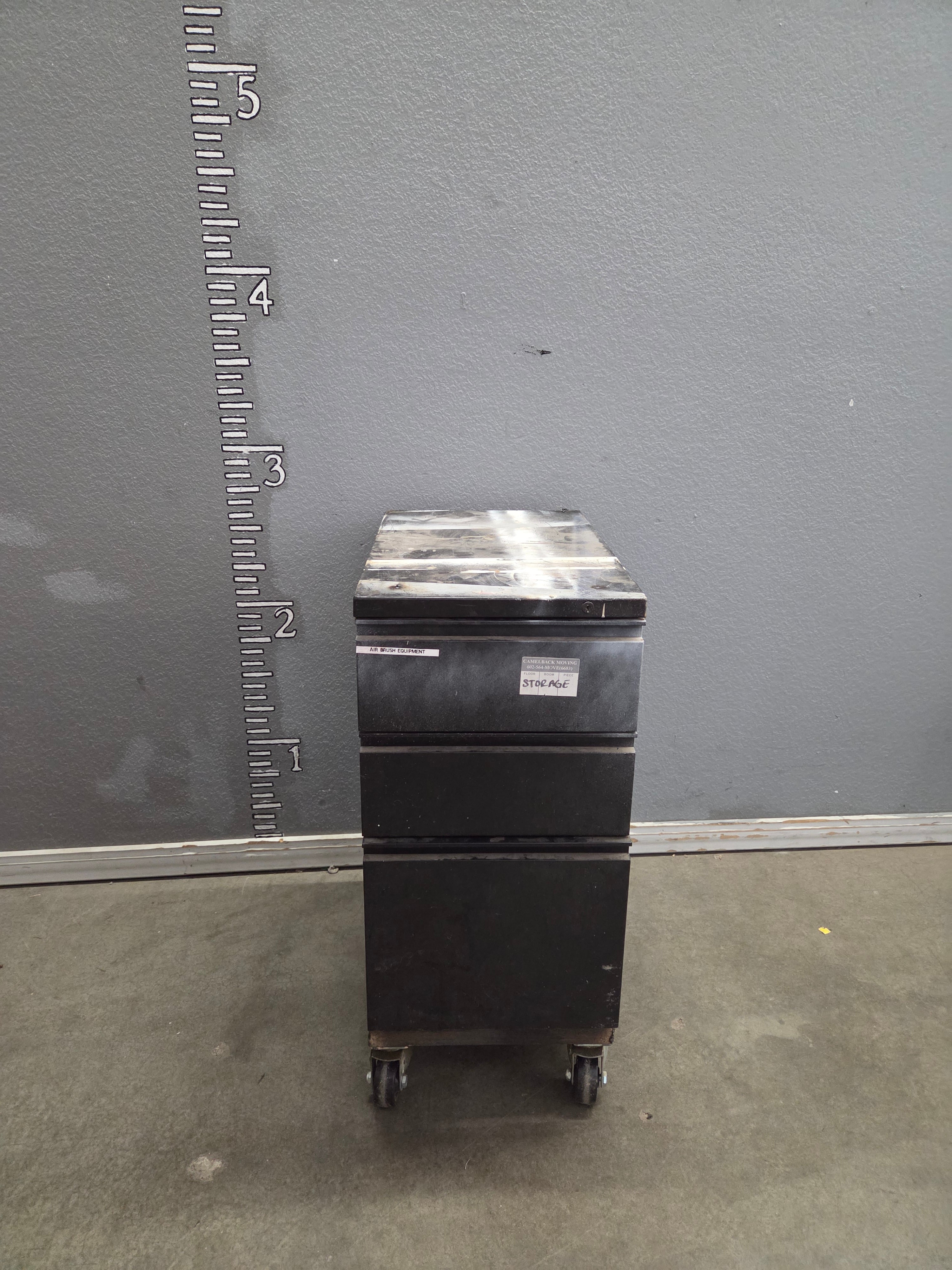 This compact black file cabinet features a durable matte finish and rolls smoothly on caster wheels. It has two spacious drawers for all your storage needs. Approximate Size: 2.5 x 1.5 x 2