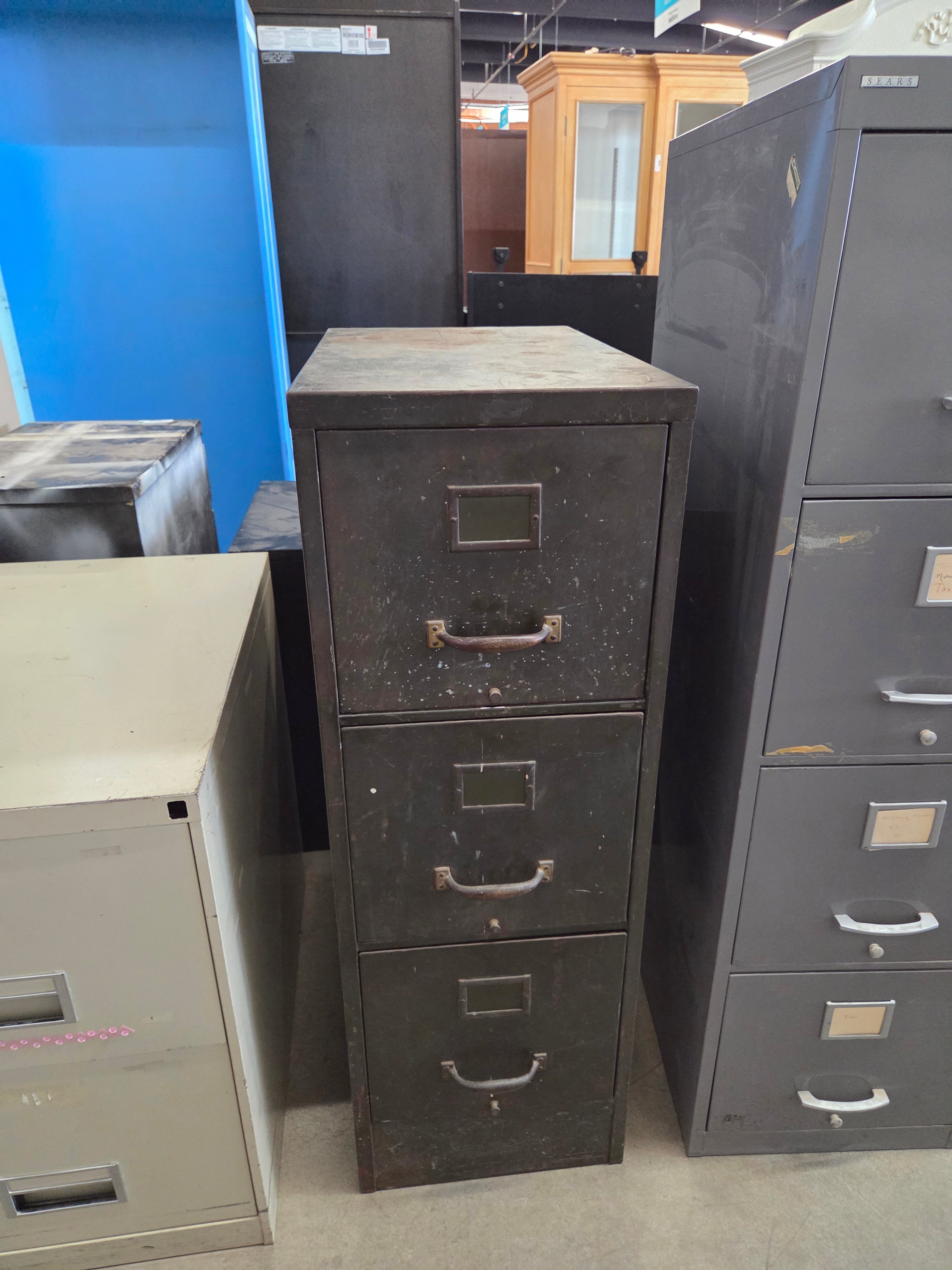 This vintage metal file cabinet features a rustic black finish, giving it a classic and sturdy appearance. With four drawers, it provides ample storage for your documents and office essentials. Approximate Size: 4 x 1.5 x 2