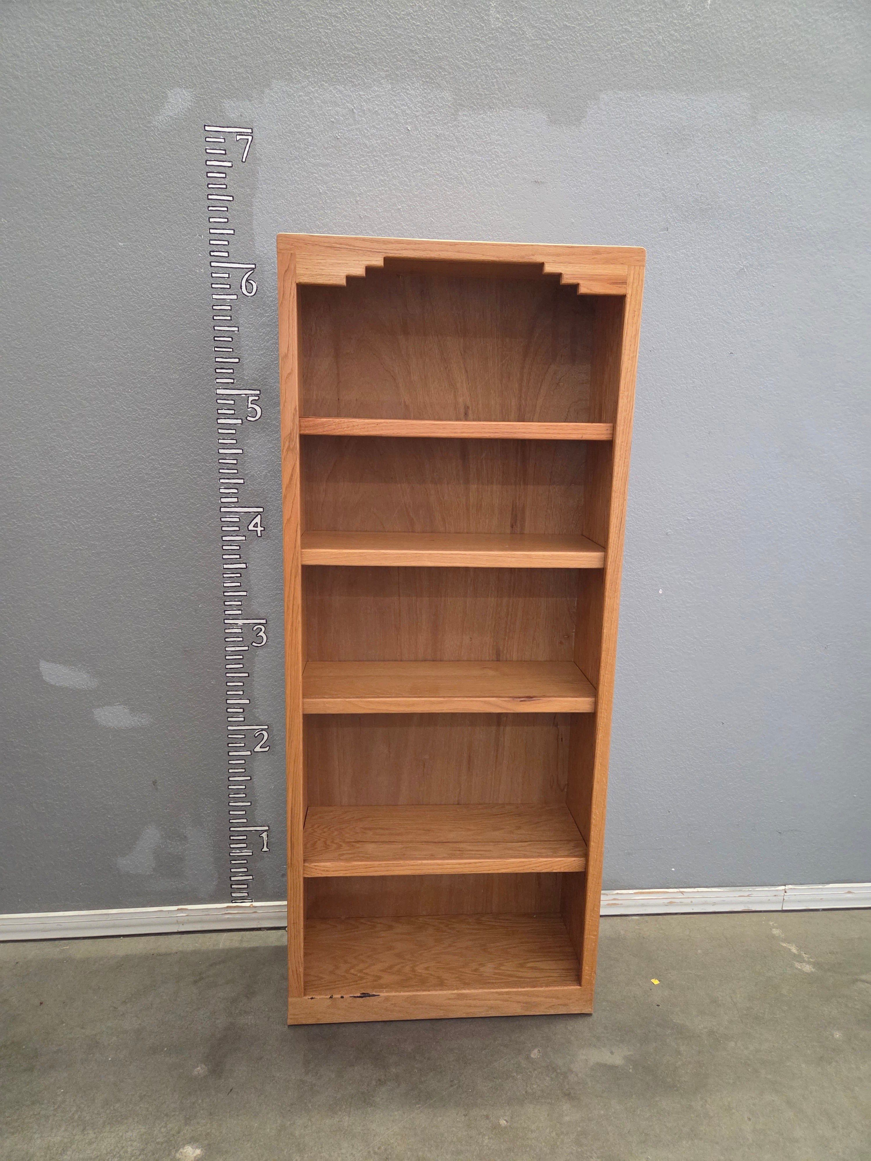 This sturdy bookshelf is crafted from rich oak wood, featuring a natural finish that highlights the wood grain. The design includes a unique stepped top detail, providing a touch of character to the piece. Approximate Size: 5.5 x 2 x 1