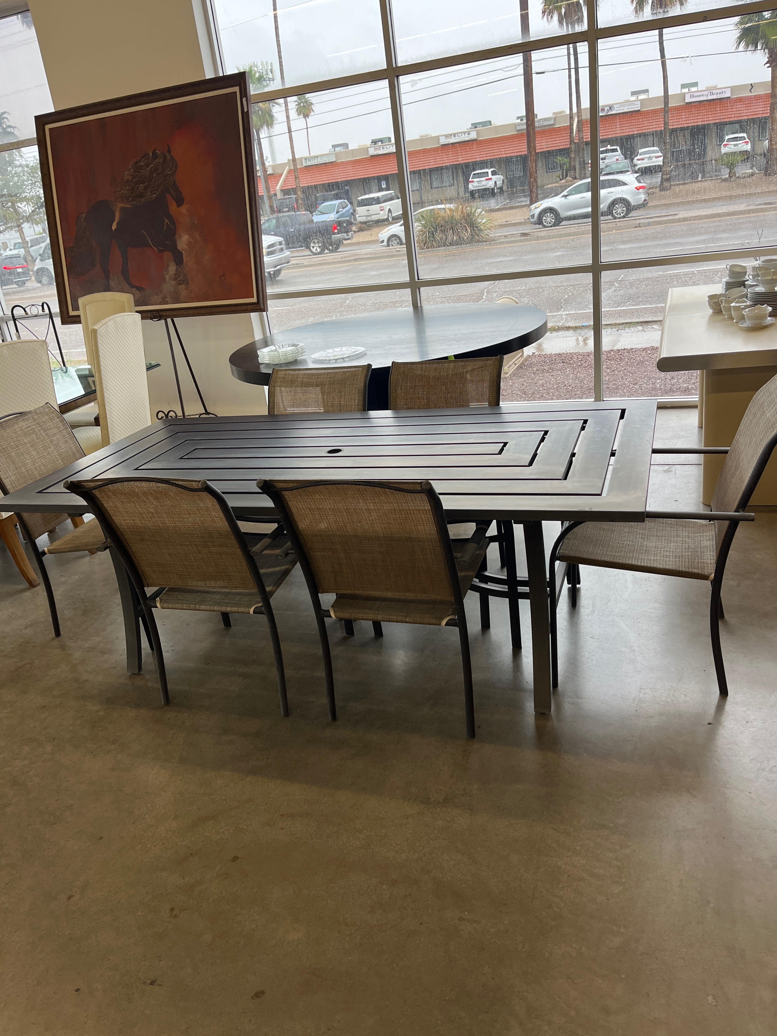 This elegant outdoor dining set includes a black metal table and six mesh chairs. The table has a sleek, weather-resistant finish, and the chairs feature durable mesh fabric in a natural tan color that complements the metal frame beautifully. Approximate Size: 2.5 x 7 x 3