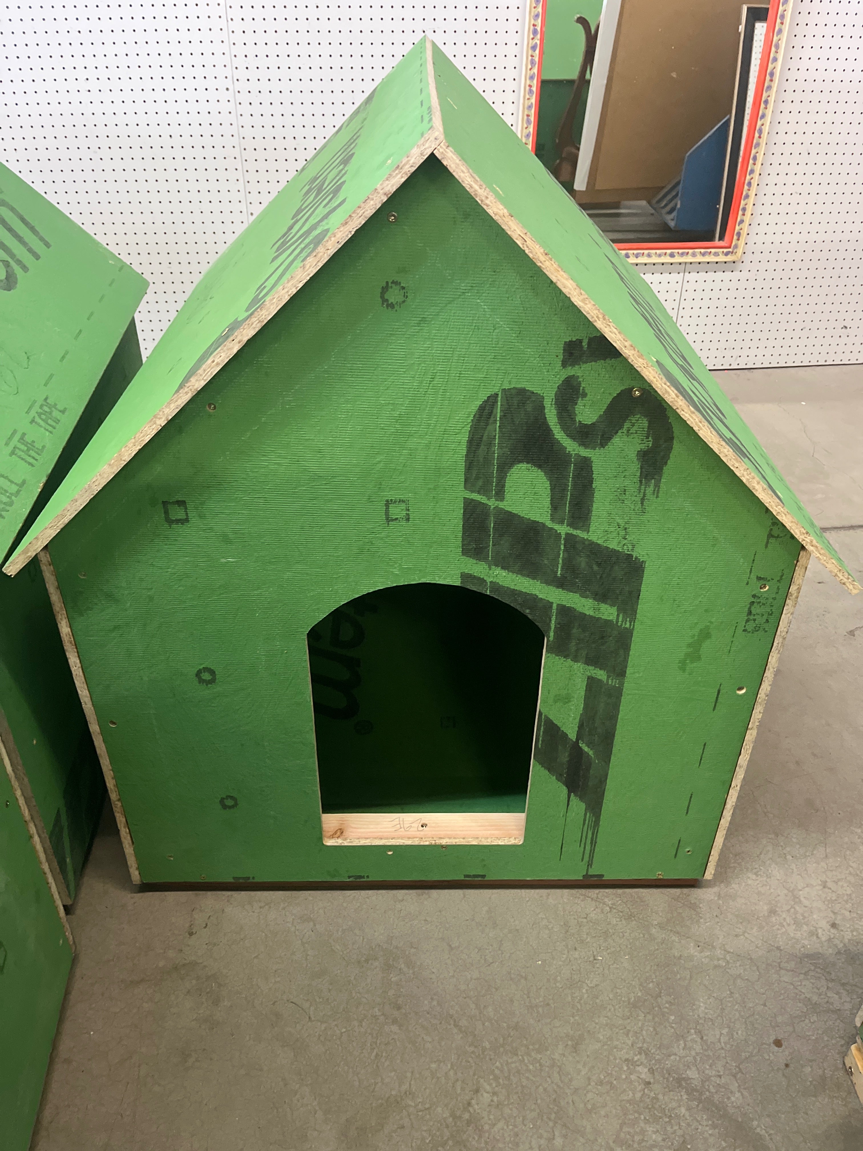 This sturdy dog house is constructed from green painted plywood with a smooth finish. Ideal for outdoor use, it provides a cozy shelter for your pet. Approximate Size: 3 x 2.5 x 2