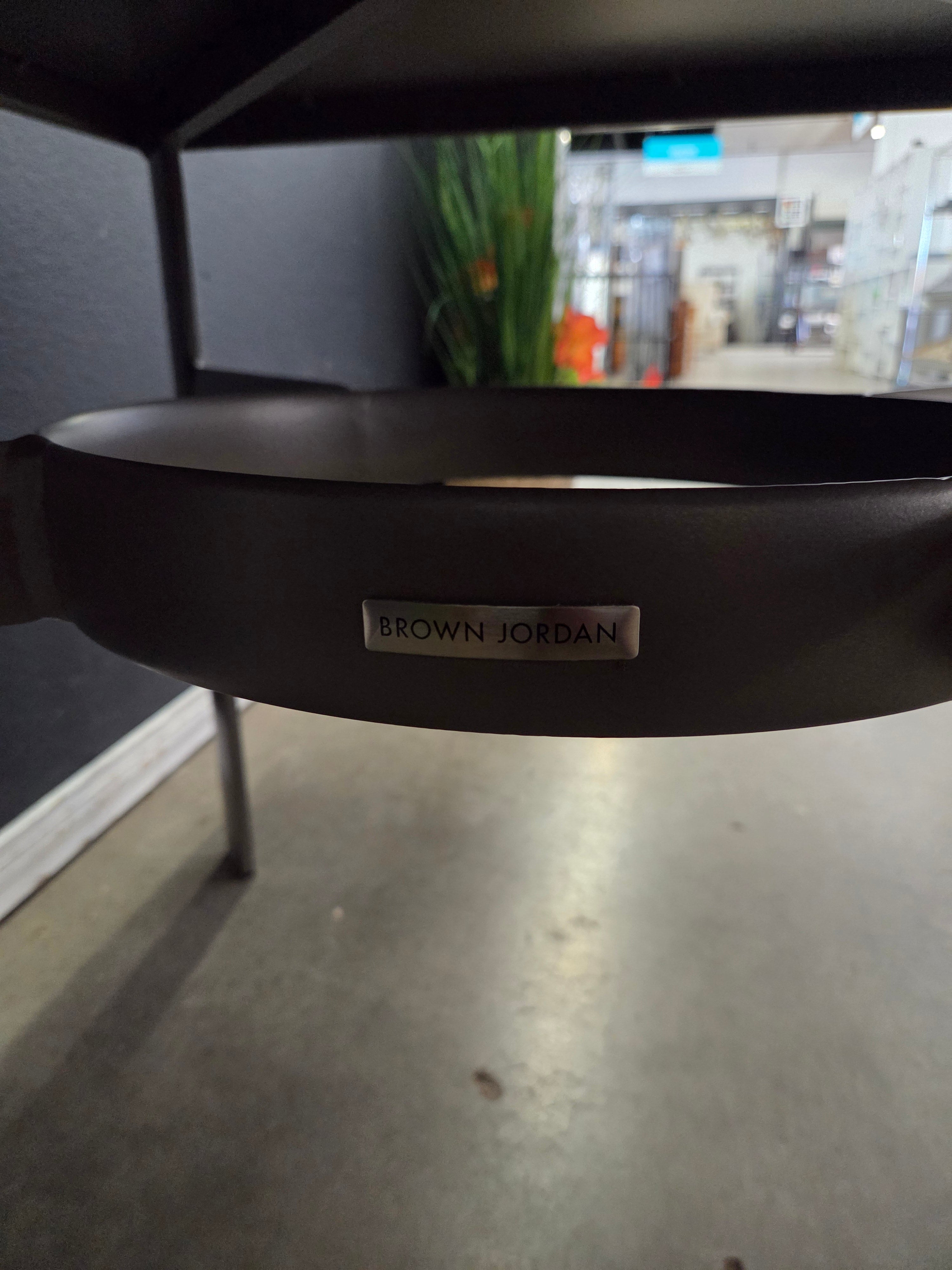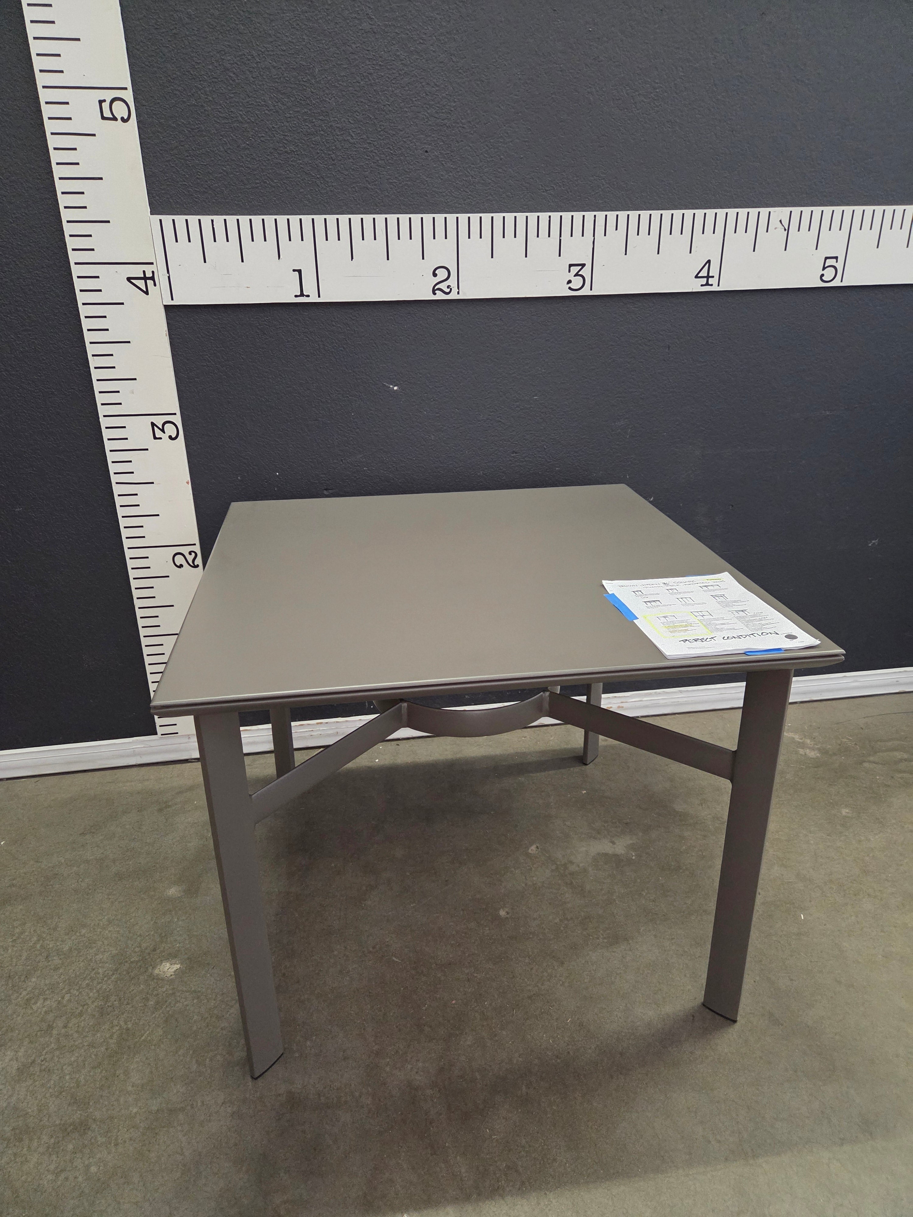 A sturdy metal table in a sleek gray color with a smooth finish, suitable for indoor or outdoor use. Approximate Size: 3 x 3 x 3