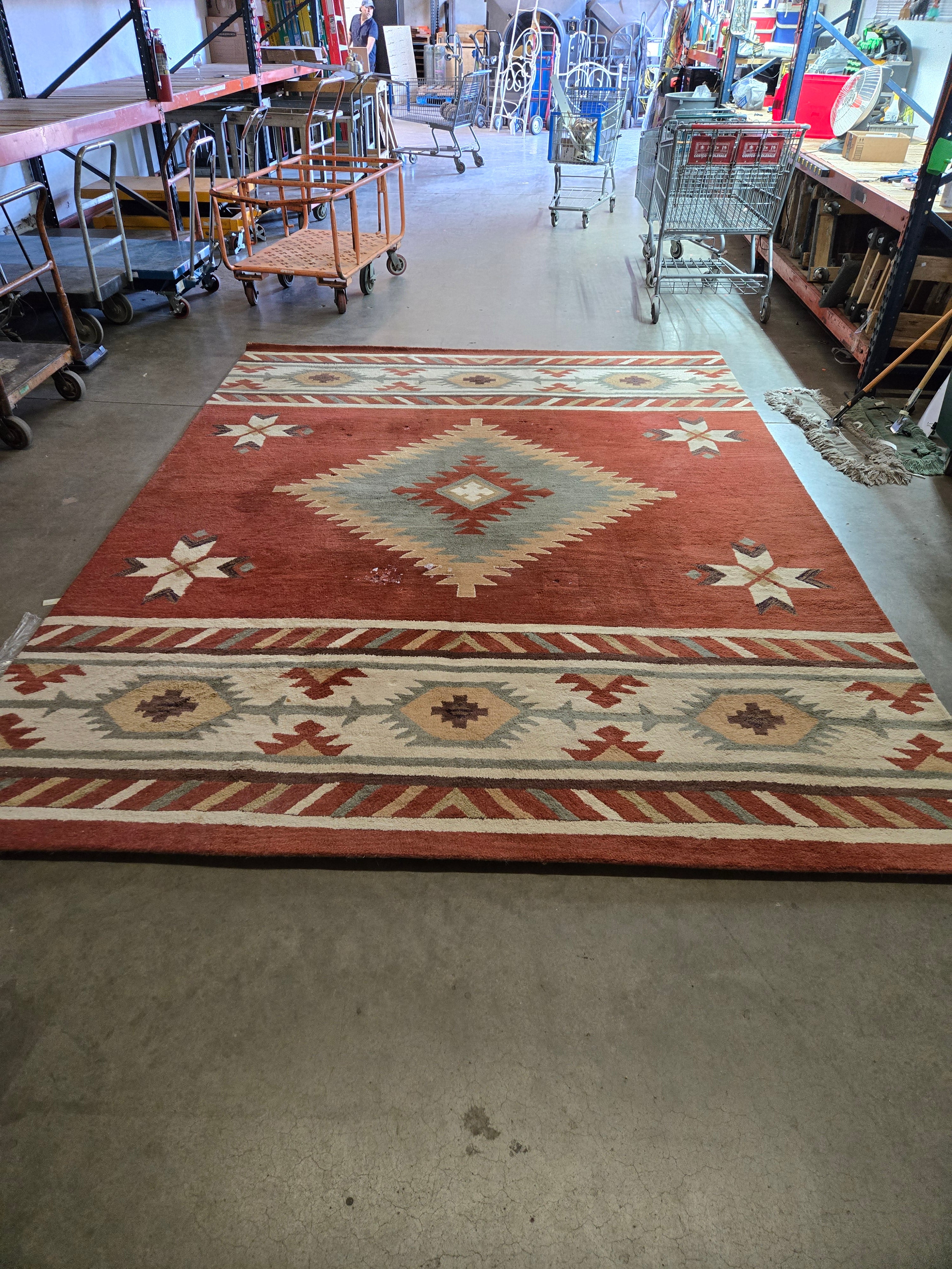 This beautiful rug features a bold geometric pattern with a rich terracotta color accented by beige and teal highlights. Made from durable fabric with a soft, flat-weave finish, it's perfect for adding warmth and style to any room. Approximate Size: 0 x 8 x 10
