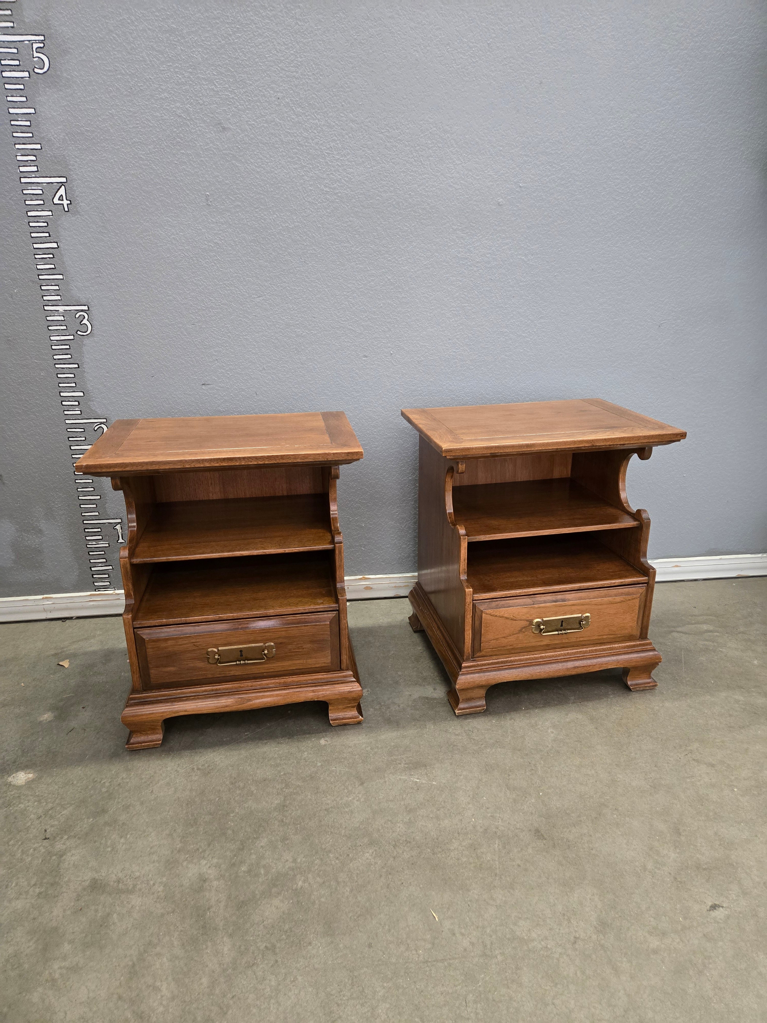 These wooden nightstands feature a warm brown finish with a classic design, including a shelf and a convenient drawer with a brass handle. Ideal for adding storage and style to your bedroom decor. Approximate Size: 2.5 x 1.5 x 1.5