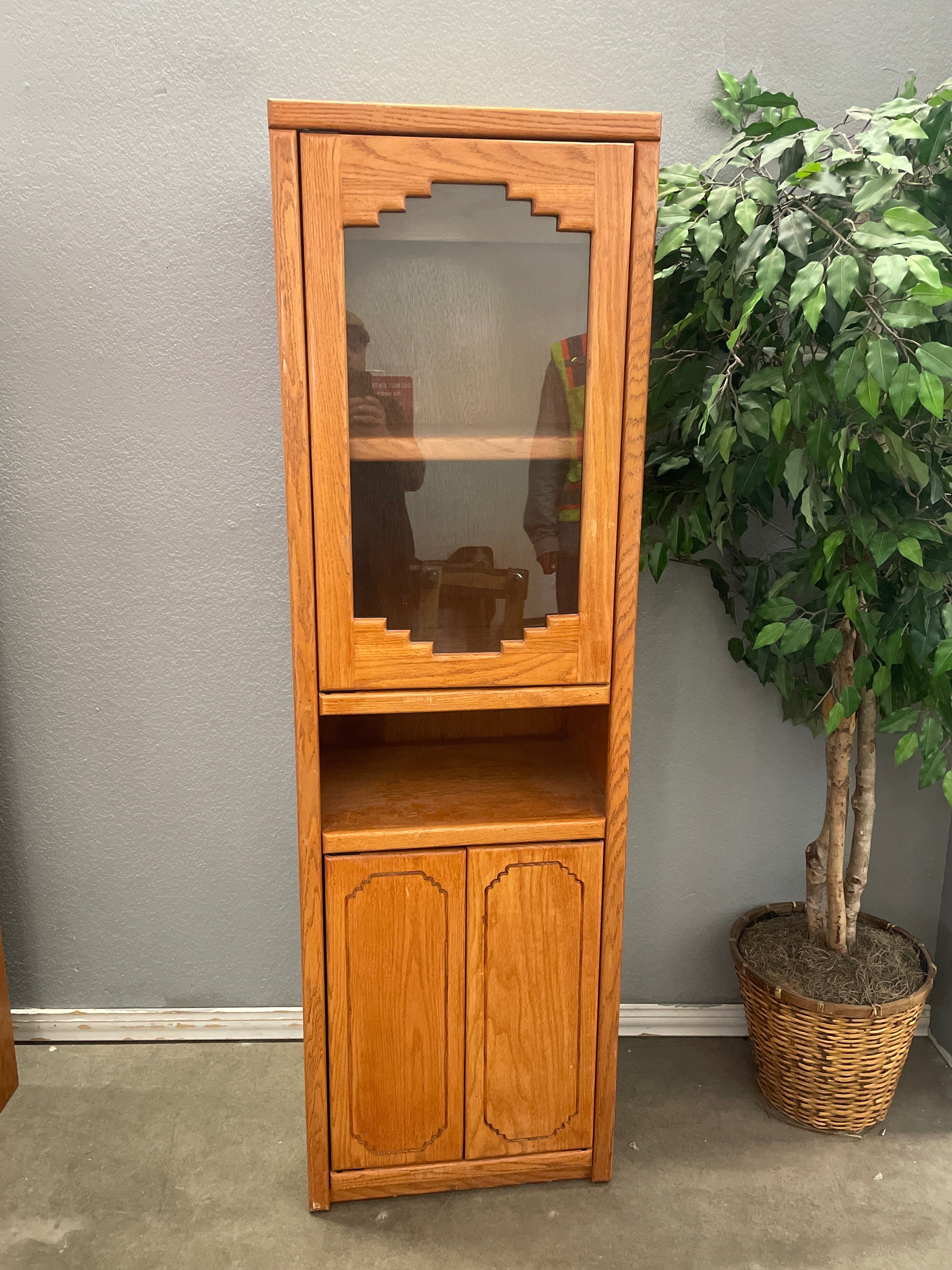 This elegant display cabinet features a warm, oak finish with a clear glass upper door perfect for showcasing your favorite items. The lower part includes wooden doors for additional storage space. Approximate Size: 6 x 2 x 1