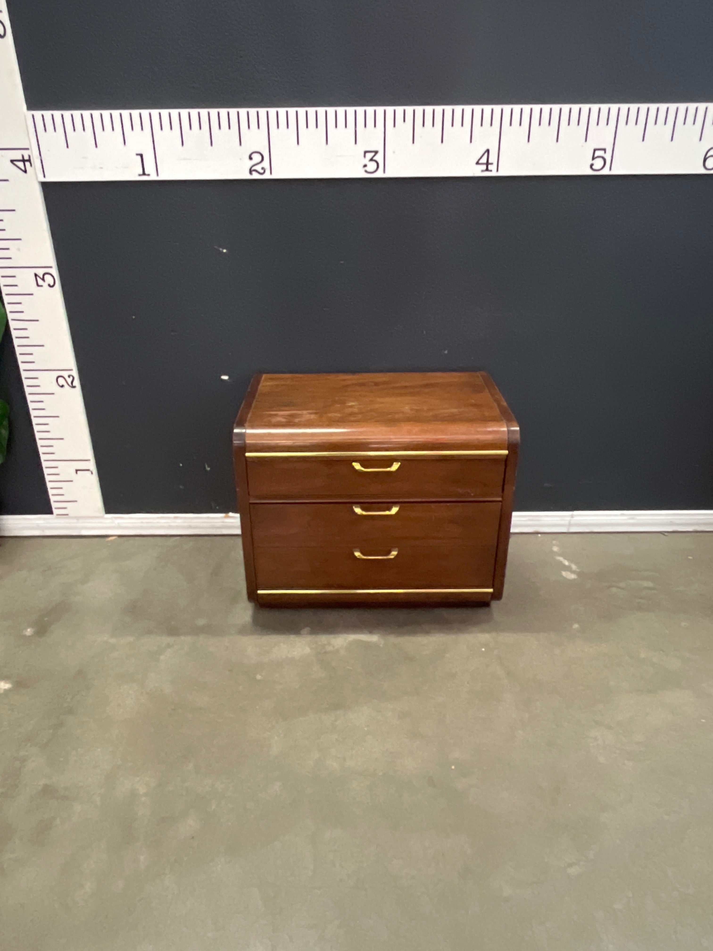 This classic nightstand features a rich brown wood finish with elegant brass handles. Perfect for adding a touch of sophistication to any bedroom decor. Approximate Size: 2 x 2.5 x 1.5