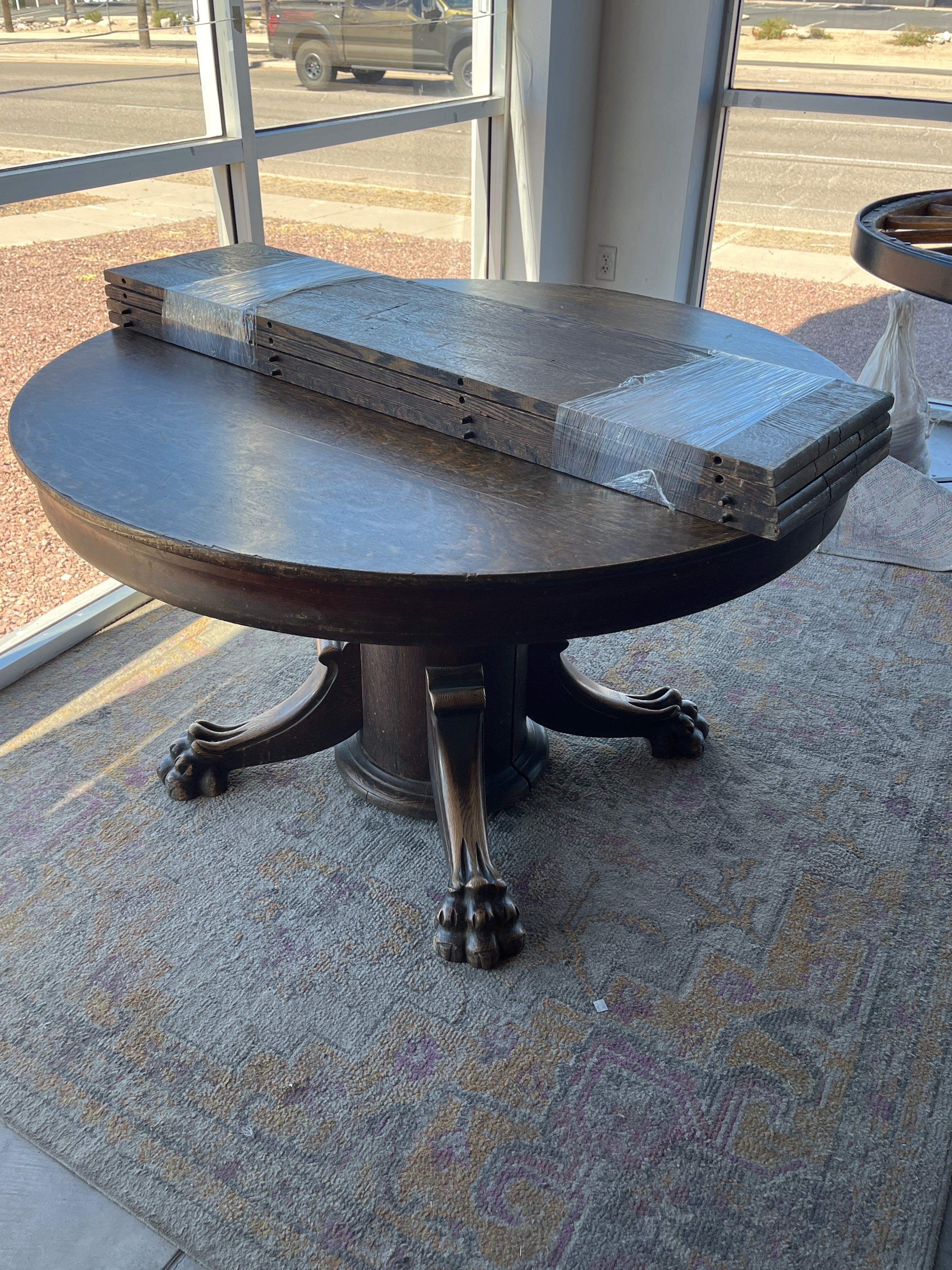 A vintage round dining table featuring a dark wood finish with intricate claw foot design, adding elegance and sophistication to any dining room. Includes wood planks for extended use. Approximate Size: 2.5 x 4 x 4