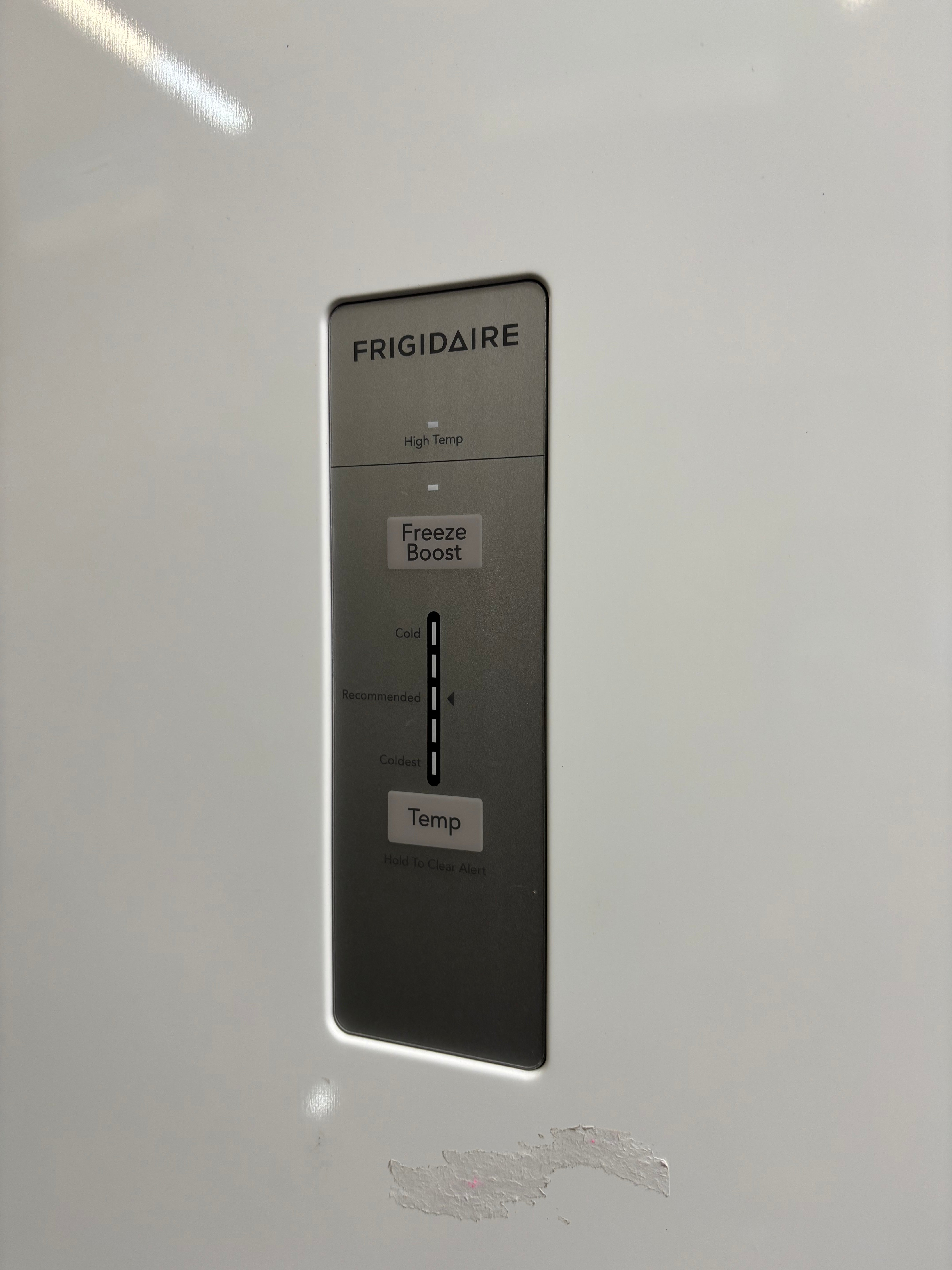 This sleek white upright freezer from Frigidaire features a clean, glossy finish with a sturdy handle designed for easy access to frozen goods. Approximate Size: 6.5 x 2.5 x 2.5